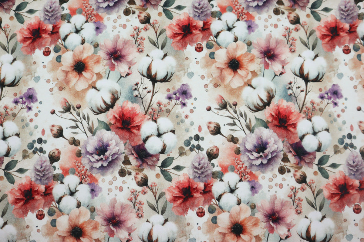 Schönes blumiges Muster mit Baumwollpflanzen in zarten pastelligen Farben.
