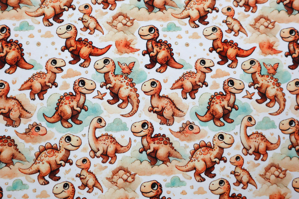Verspieltes Muster mit kleinen Dinosauriern in zarten Naturtönen.