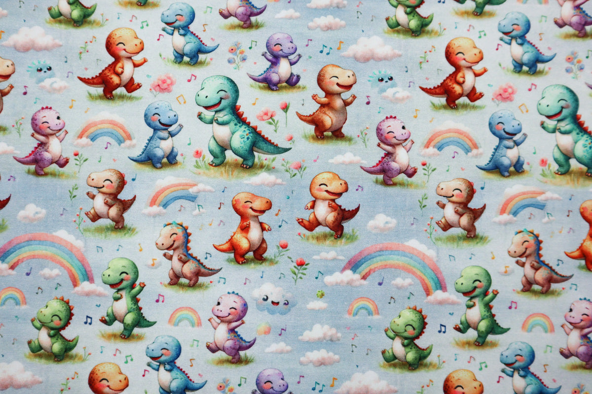 Tolles Dino Muster mit bunten Regenbögen, Musiknoten und bunten, lachenden Dinos.