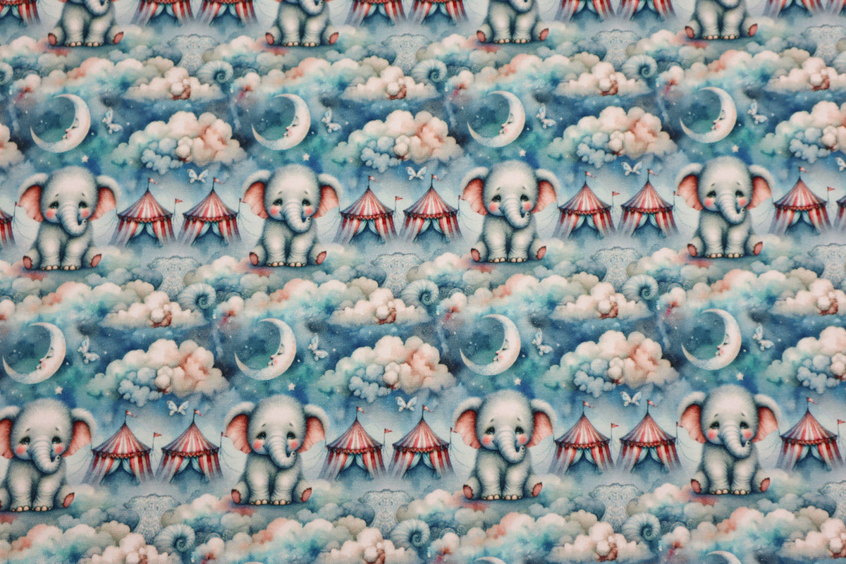 Wunderschöner Baumwolljersey für Kinder mit kleinen Elefanten im Traumland.