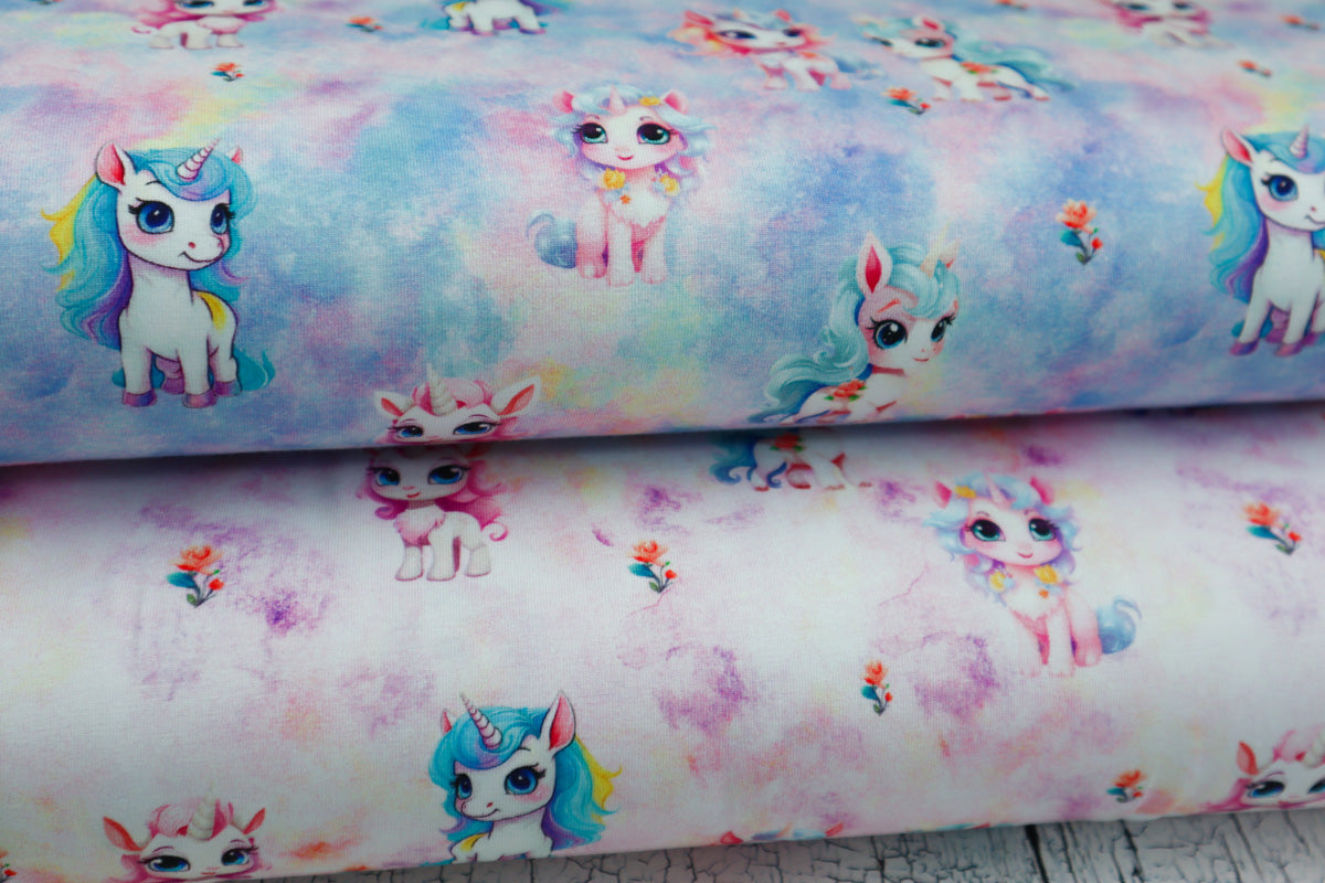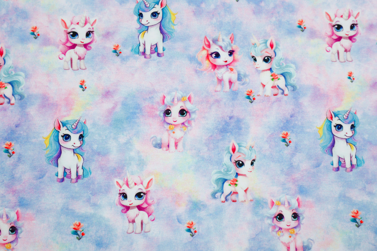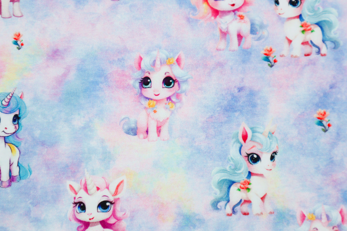 Tolles Muster mit kleinen Einhörnern auf gebatiktem Hintergrund.