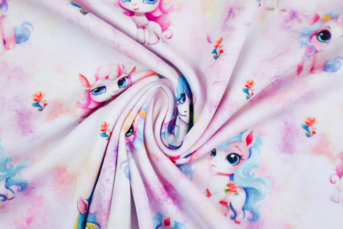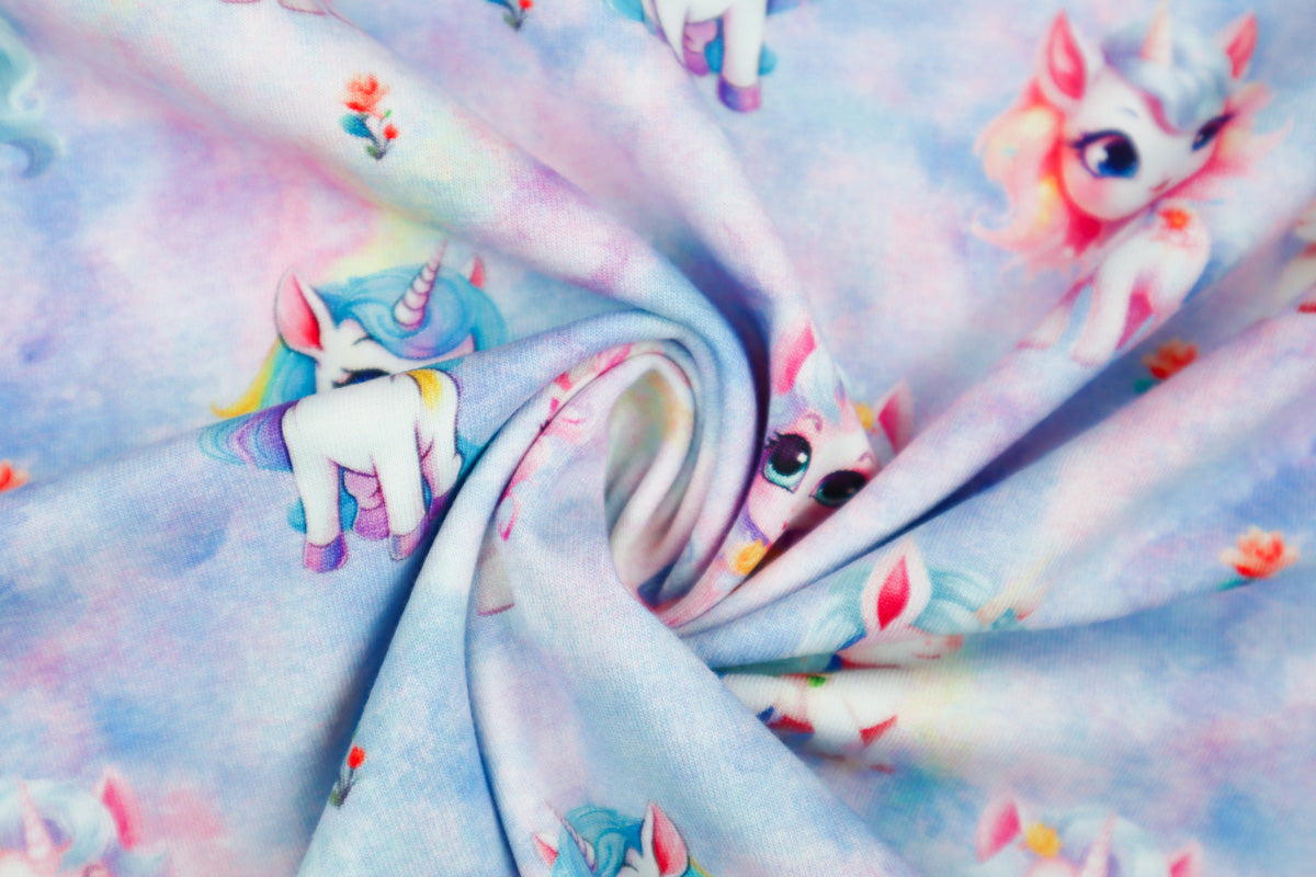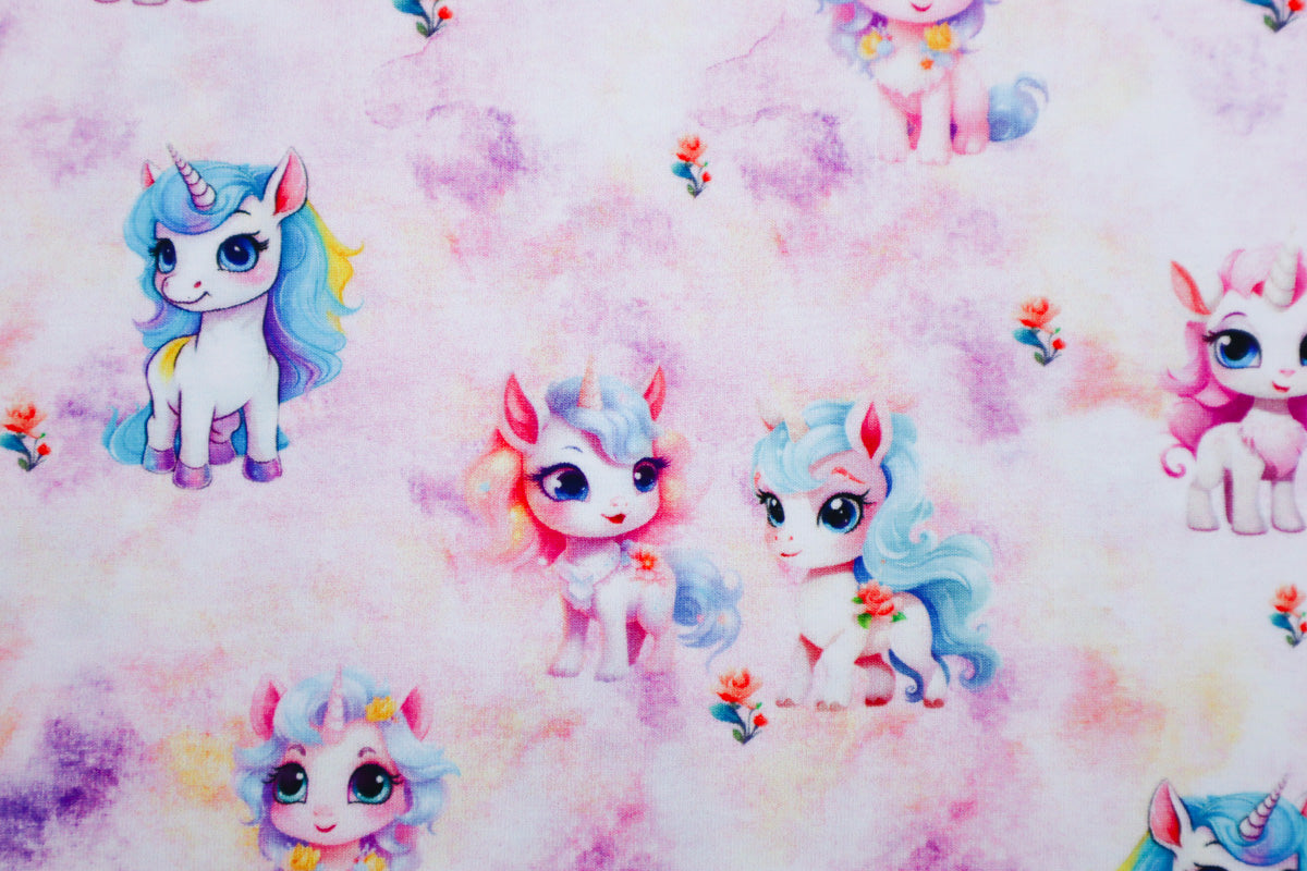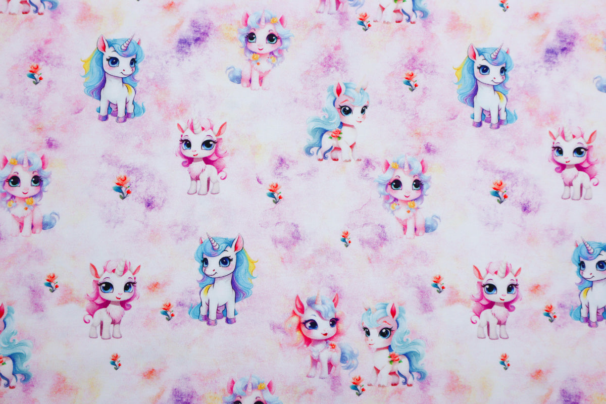 Tolles Muster mit kleinen Einhörnern auf gebatiktem Hintergrund.