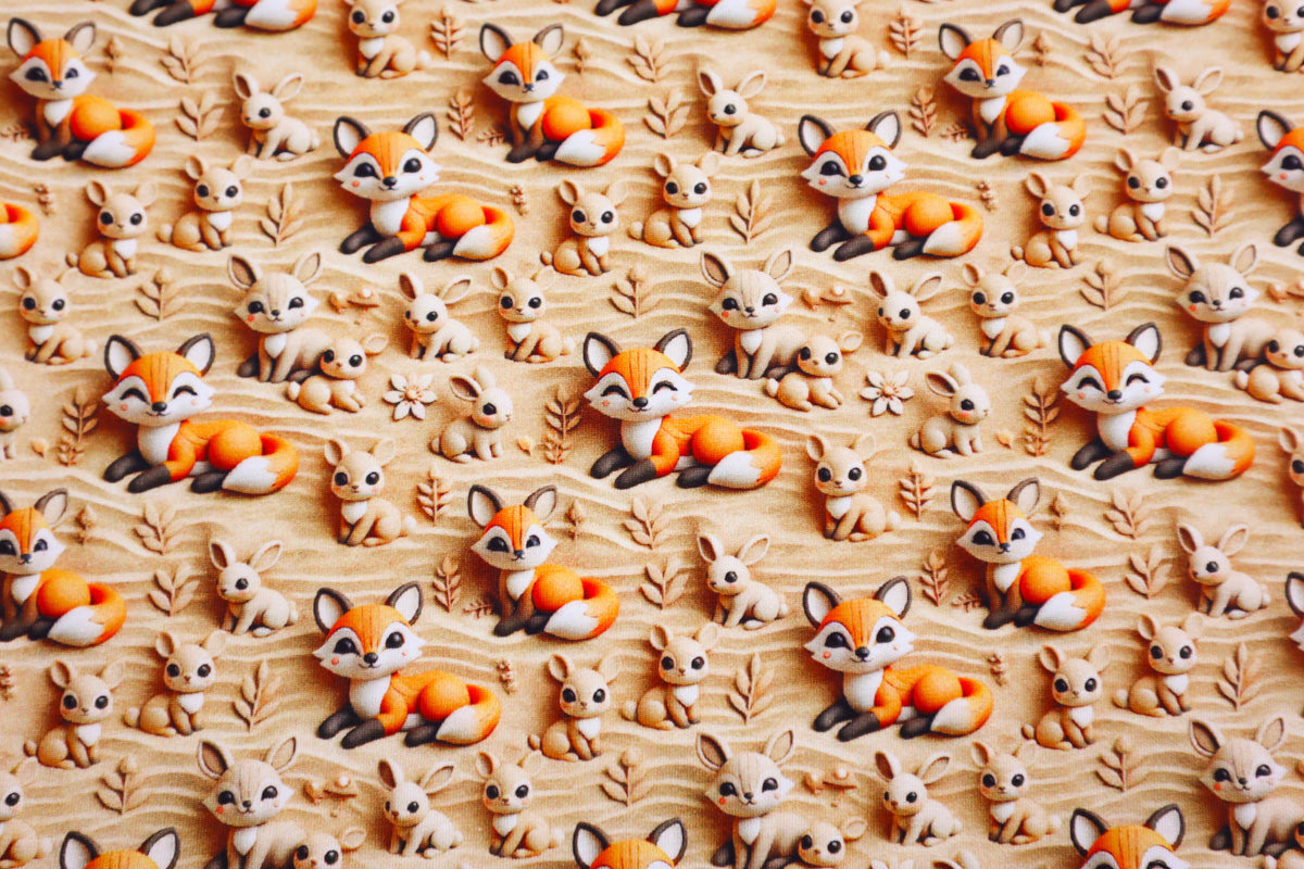 Schönes Muster mit Füchsen und kleinen Häschen auf naturfarbenem, gewelltem Hintergrund.