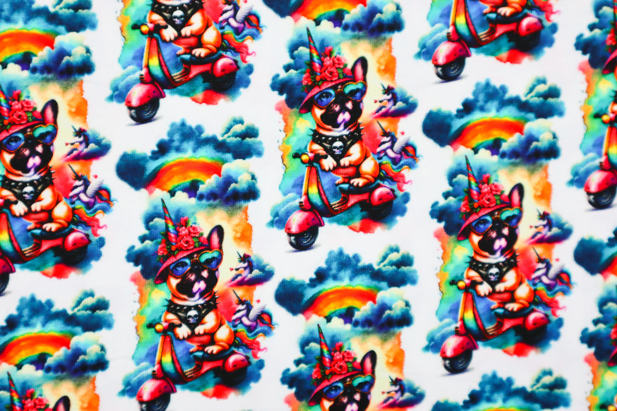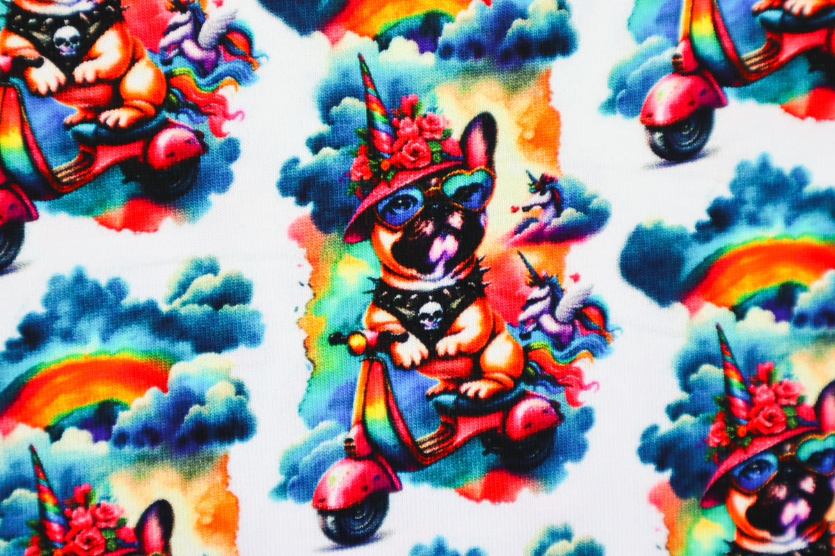 Super cooles Muster mit extravagantem Mops auf seinem Roller.