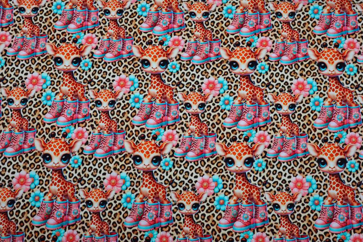 Niedliche, kleine Giraffe kombiniert mit Blümchen und Leopardenmuster.