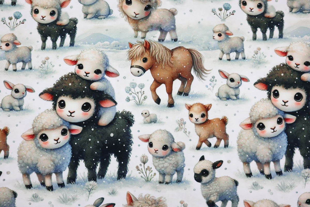 Niedliches Muster mit Schafen, Pferden und Häschen auf weiß verschneiter Winterwiese.