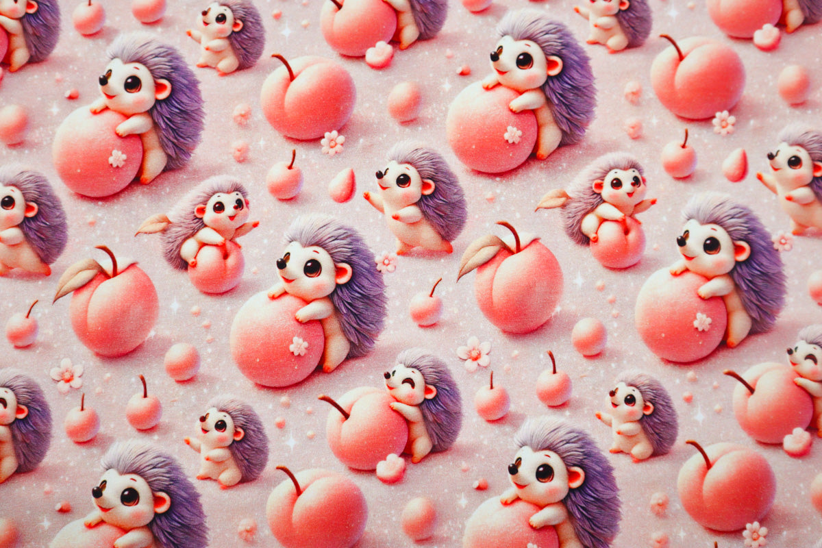 Schönes Muster mit Igeln und Früchten in tollen Farben auf altrosa Hintergrund.