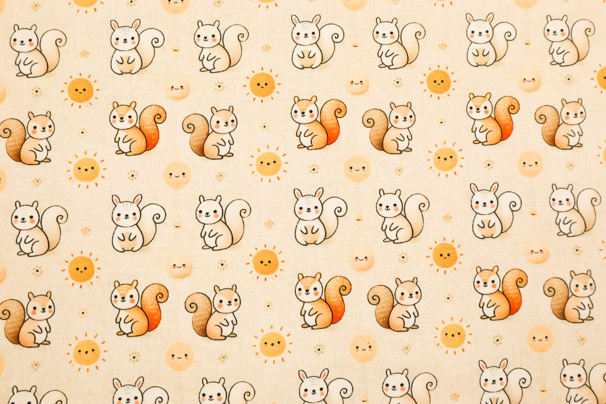Niedliche kleine Eichhörnchen und Sonnen auf zart gemustertem Hintergrund.