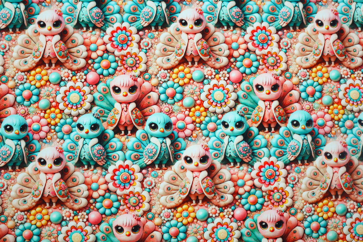 Tolles buntes Muster in zarten Farben mit eleganten Pfauen und bunten Blüten in 3D Optik.