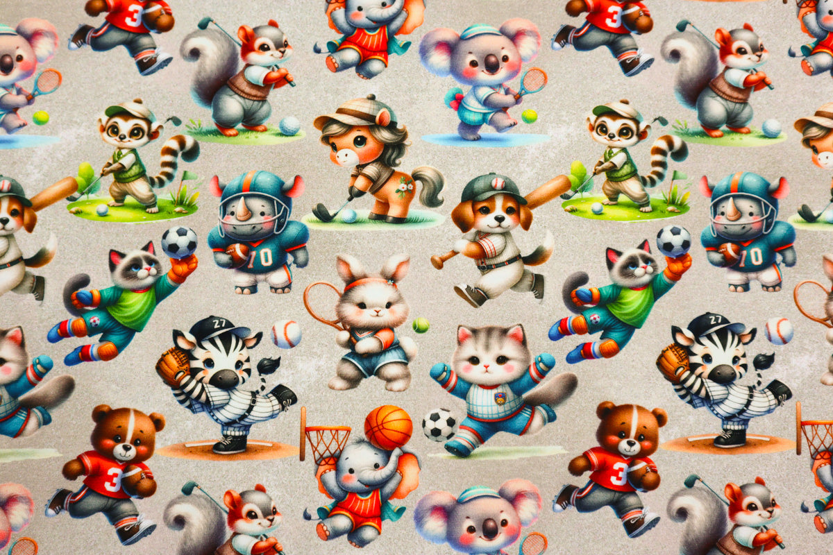 Super süßer Baumwolljersey für Kinder mit niedlichen Tieren die Sport machen.