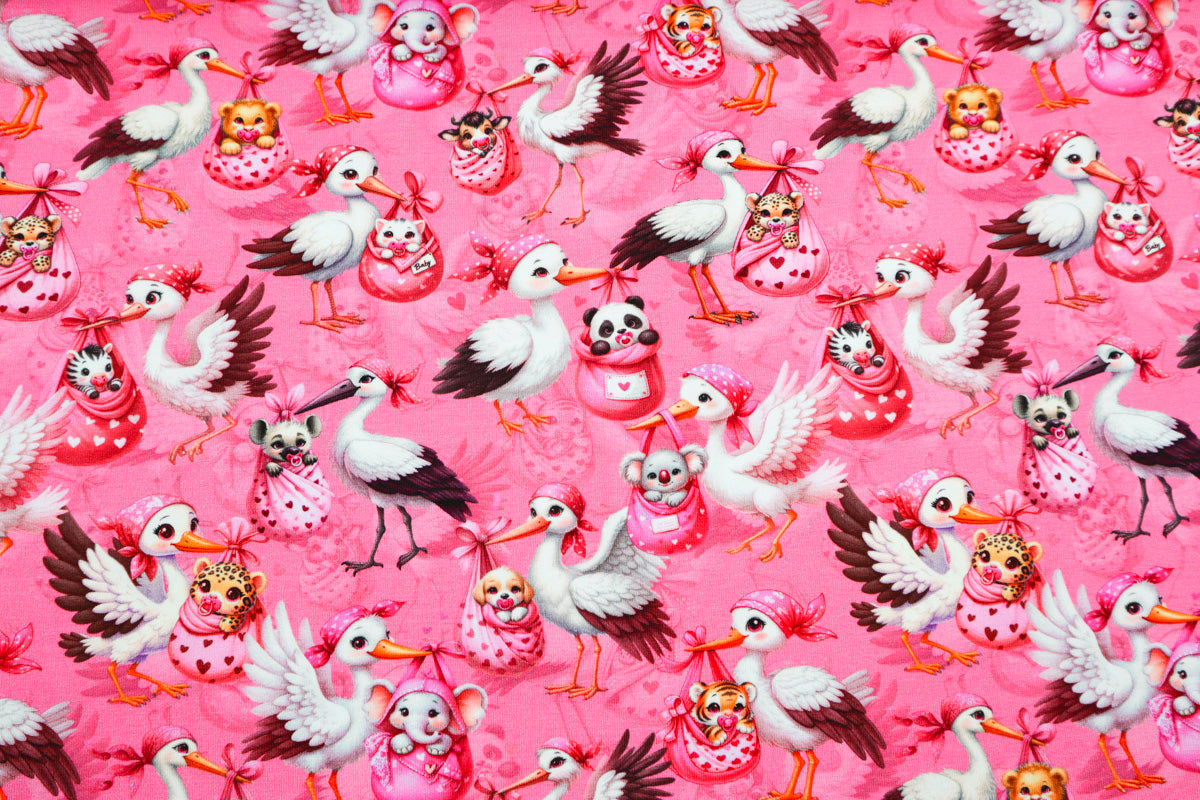 Super süßer Baumwolljersey für Kinder mit niedlichen Störchen und kleinen Babytieren auf pinkem Hintergrund.