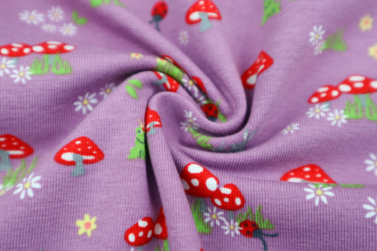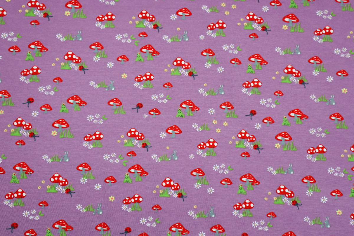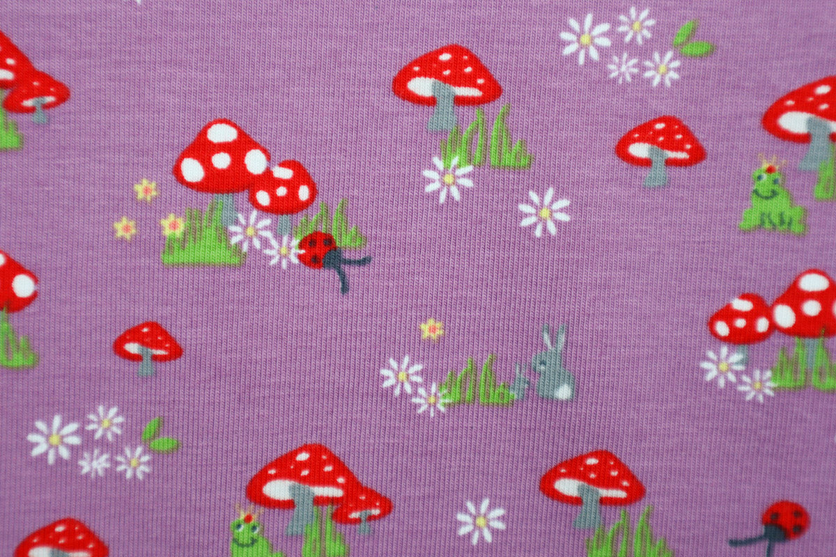 Super schöner Baumwolljersey kleinen Fliegenpilzen, Fröschen und Hasen.