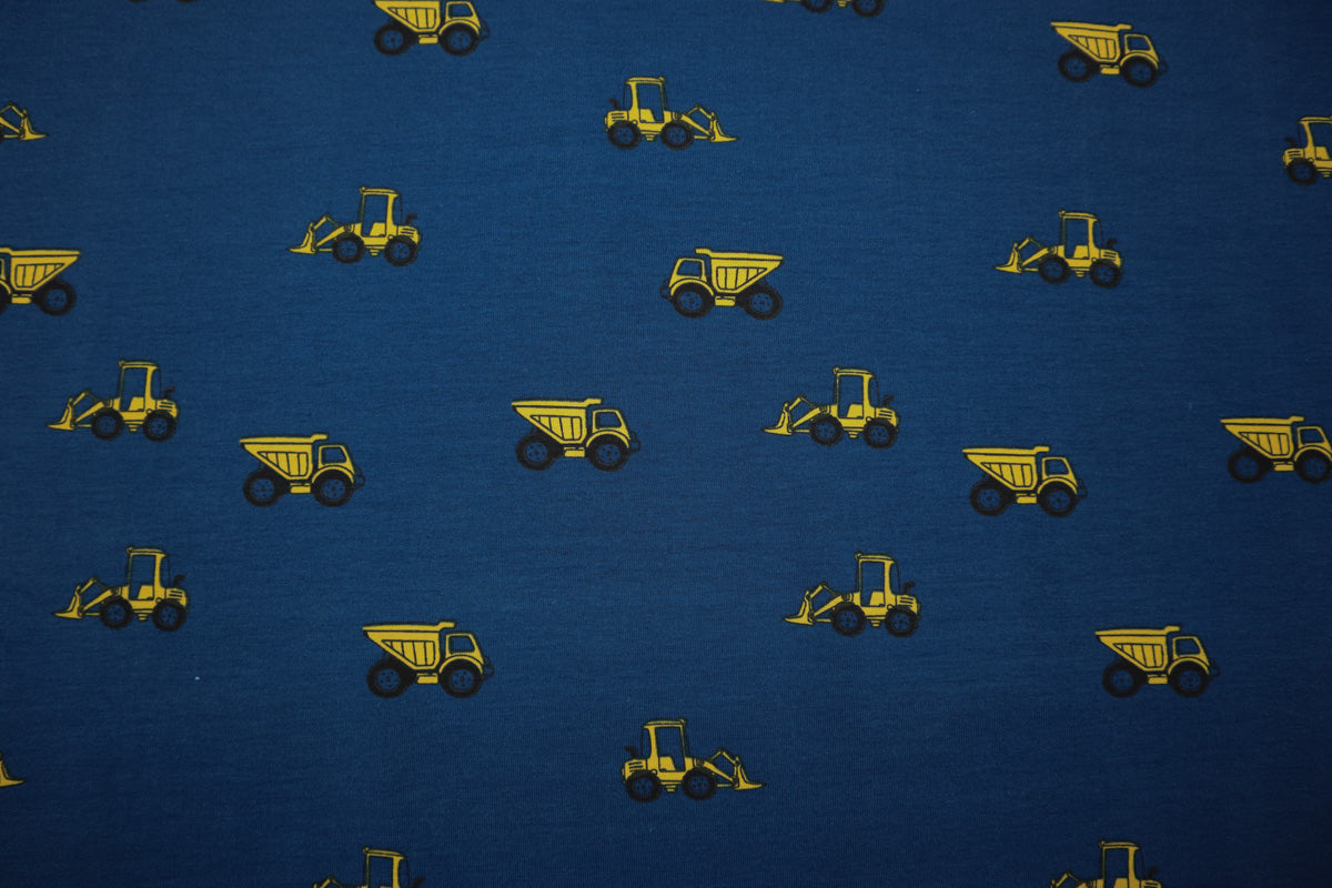 Cooles Muster mit gelben Baustellenfahrzeugen auf dunkelblauem Hintergrund.