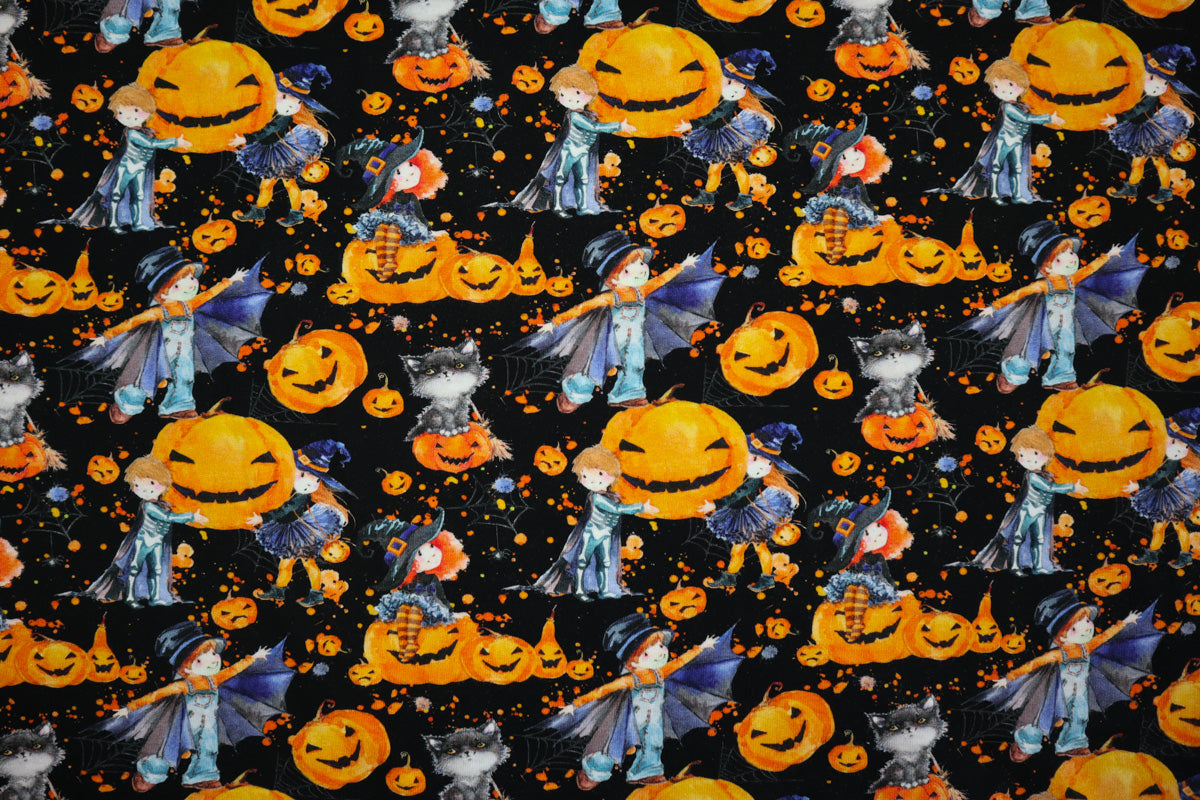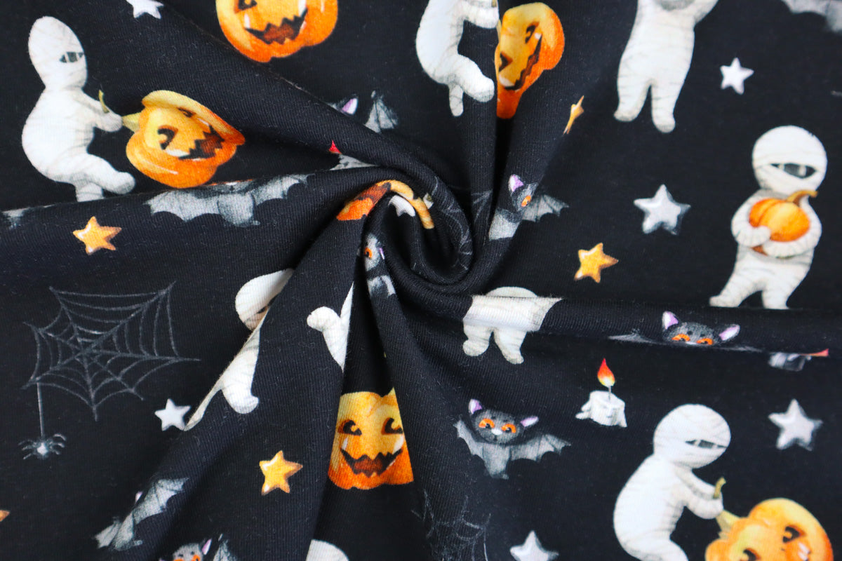 Richtig cooler Halloween Jersey mit Fledermäusen, Mumien und natürlich vielen knallig orangen Kürbissen.