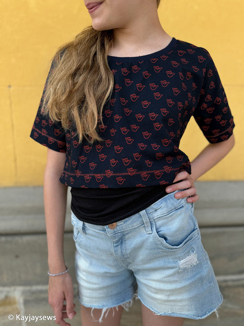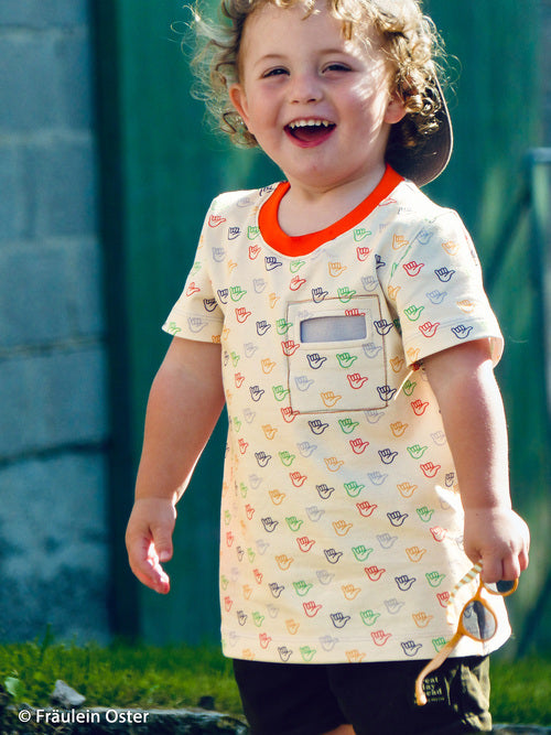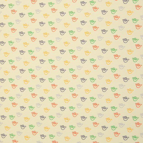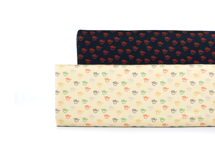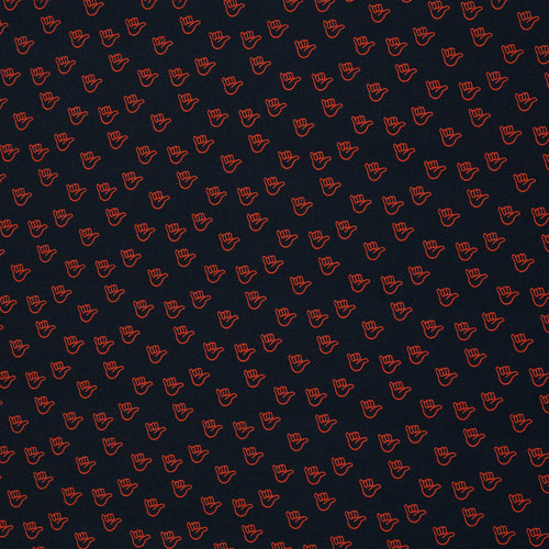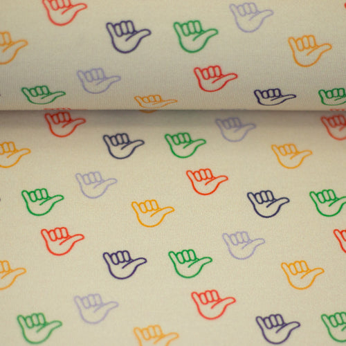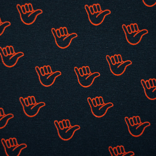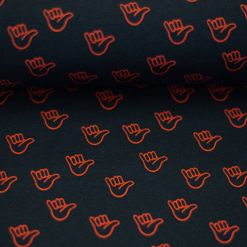 Baumwolljersey Hang Loose: Der Surfergruß als allover Pattern. Dezent, aber sicher nicht langweilig! Orangerot auf Dunkelblau oder bunte Hände auf Naturweiß. Super geeignet für lässige Shirts, Leggings und vieles mehr.