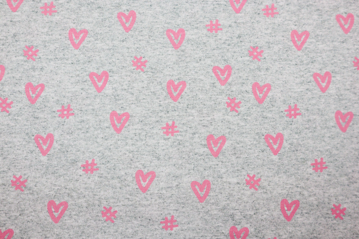 Tolles Muster mit rosa Herzen und Hashtags auf grau meliertem Hintergrund.