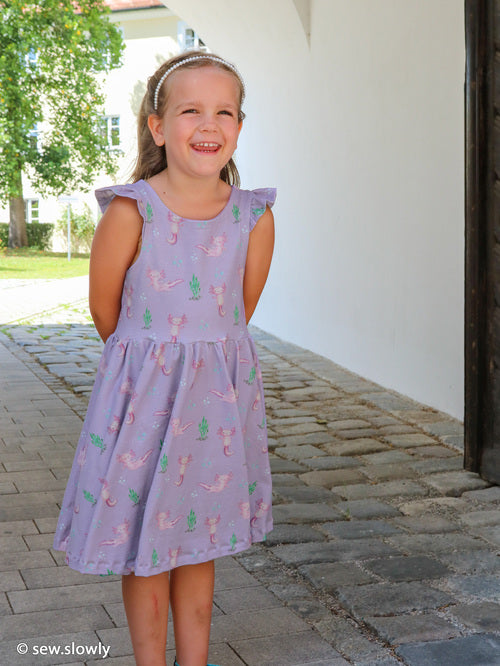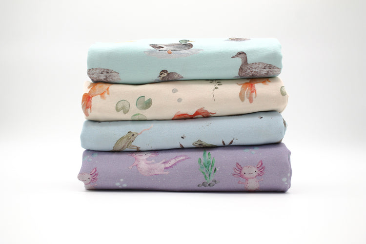 Im und am Teich kann man so viele Tiere entdecken! Die handgemalten Aquarell-Designs zeigen einige dieser Teich- und Wassertiere: Enten, Frösche, Goldfische und Axolotl.