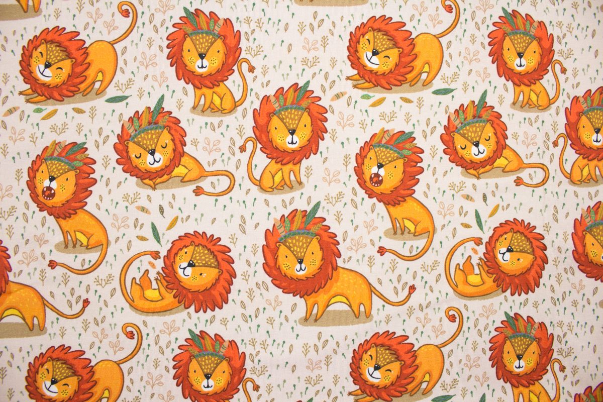 Toller Jersey für alle mutiger, kleinen Abenteurer mit süßem Löwen im Indianerlook. Leuchtendes gelb/orange auf hellbeigem Hintergund.