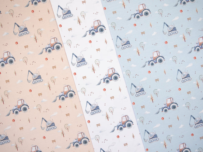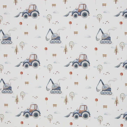 Auf Sandbeige, Weiß und Hellblau gibt es die Baufahrzeuge und allerlei Baustellenmotive.