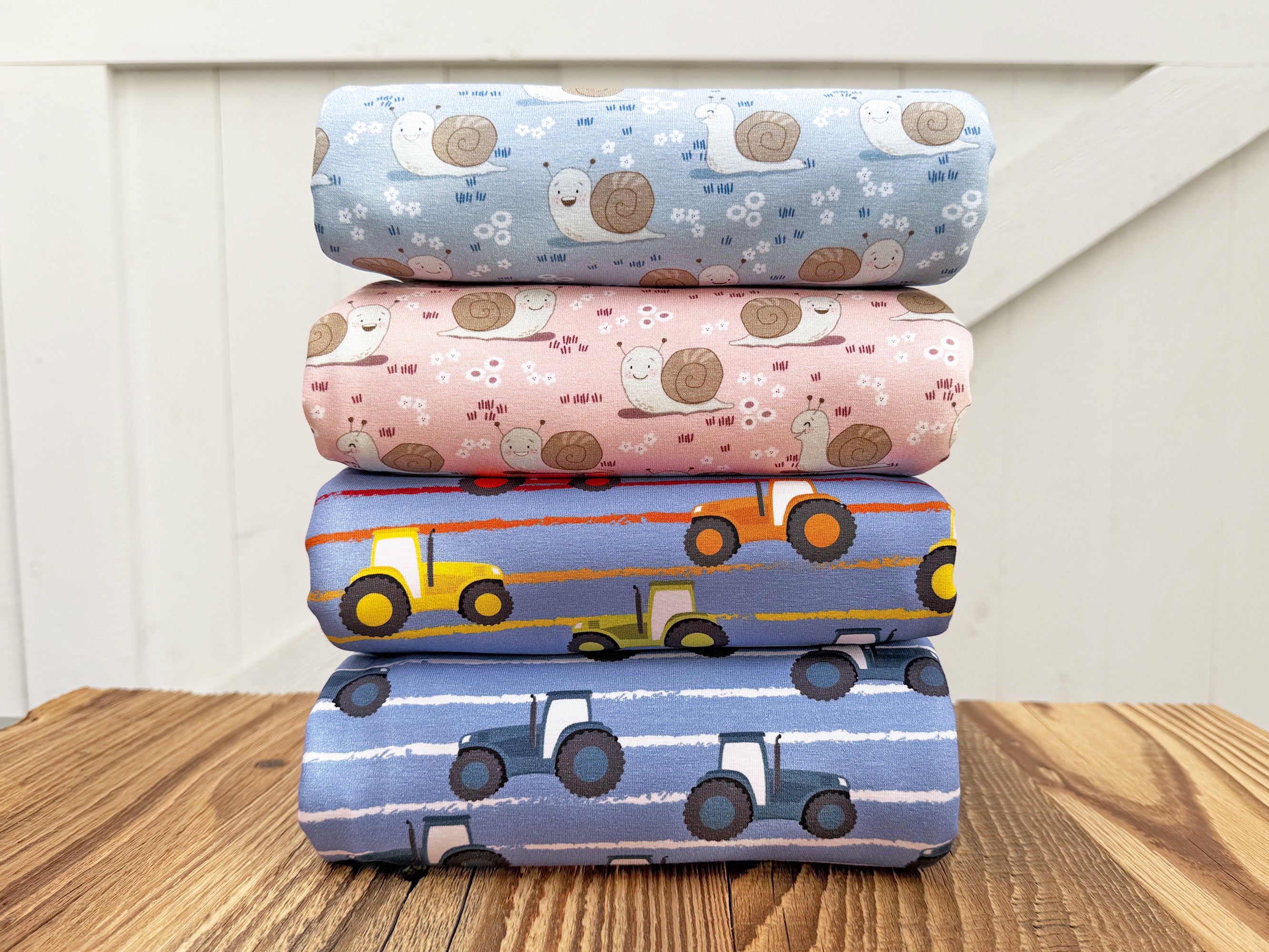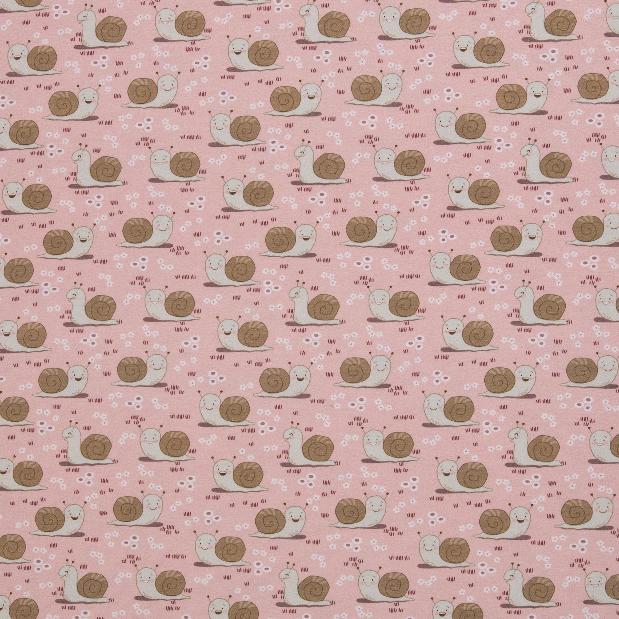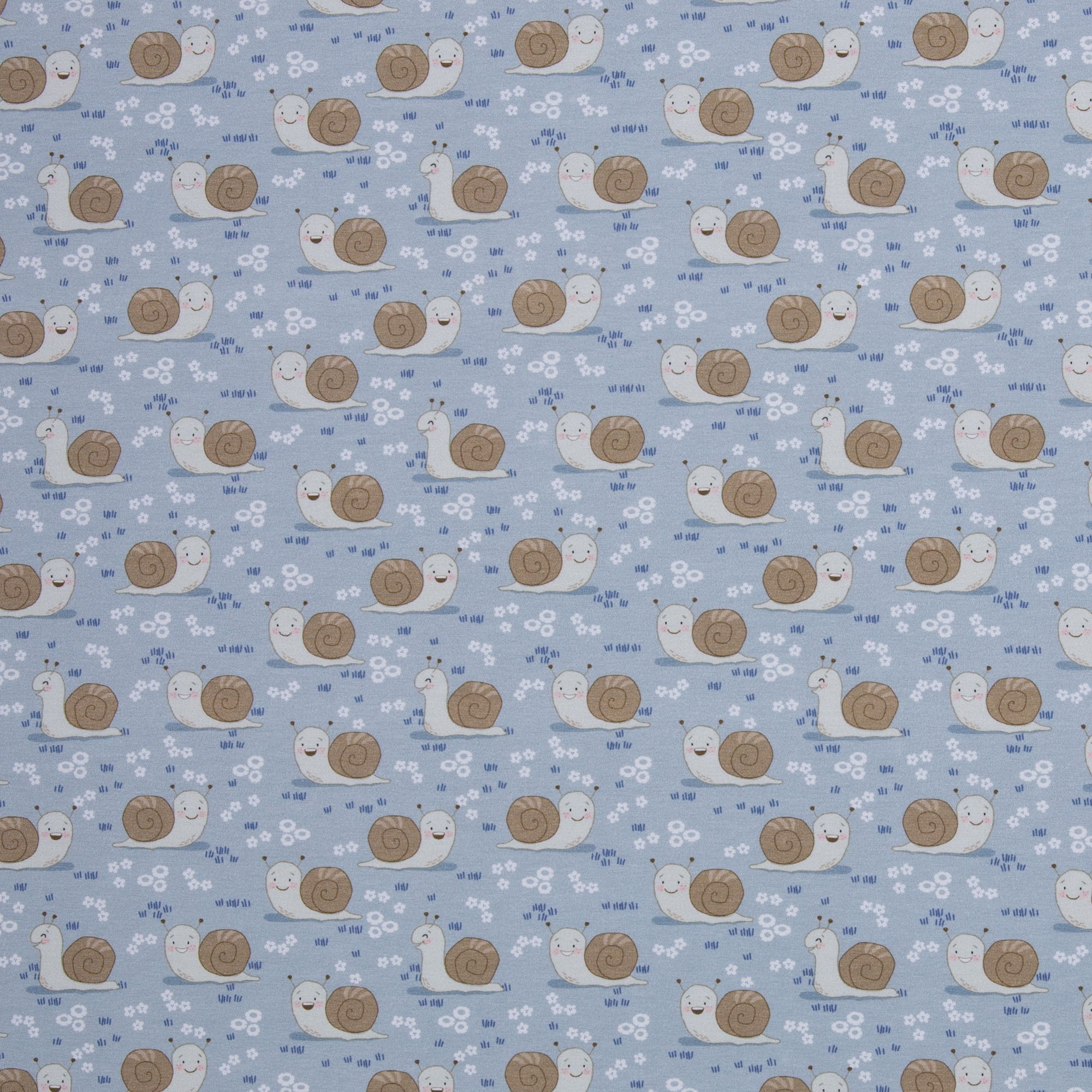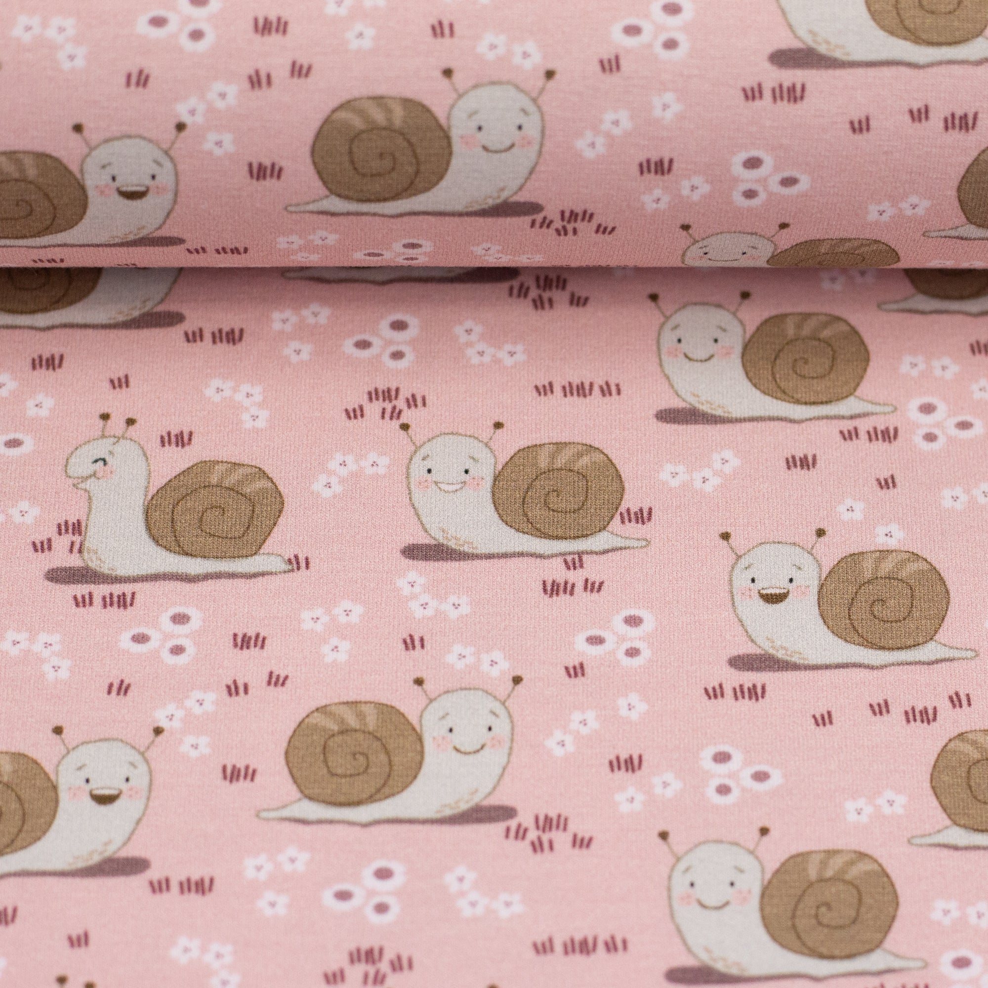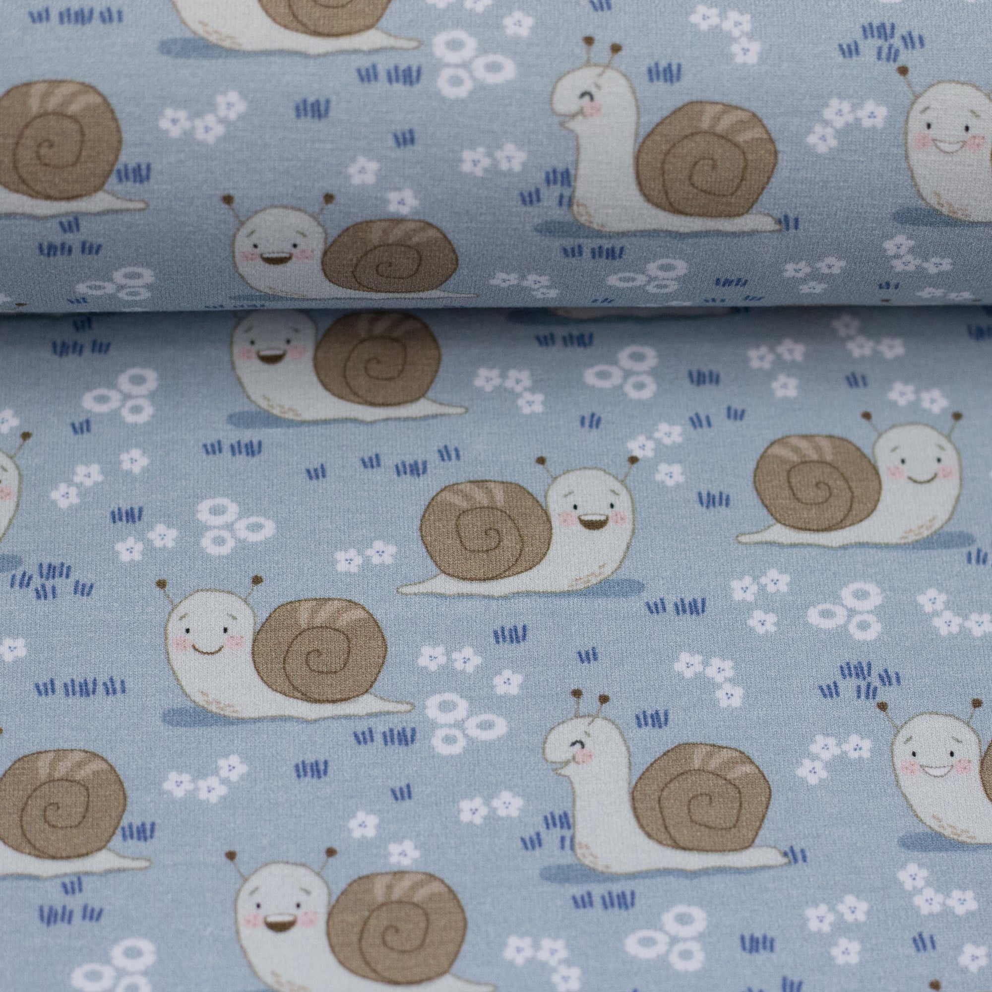 Fröhliche Schnecken in zarter Watercolor-Optik ziehen sich gleichmäßig über den Stoff. Erhältlich auf hellem Blau oder sanftem Rosa, ergänzt durch kleine Blüten und Grasdetails, wirkt das Motiv ruhig, freundlich und wunderbar harmonisch – ideal für verspielte Kinderkleidung.