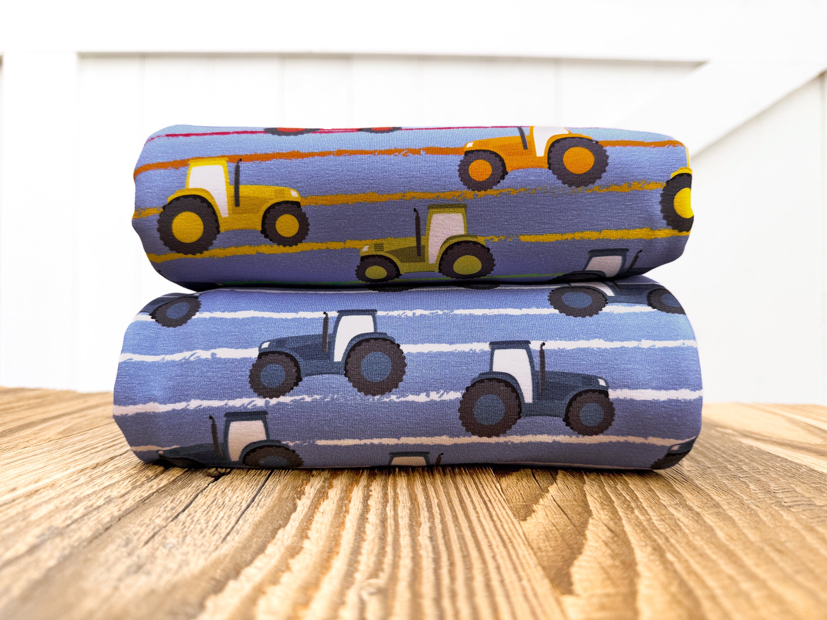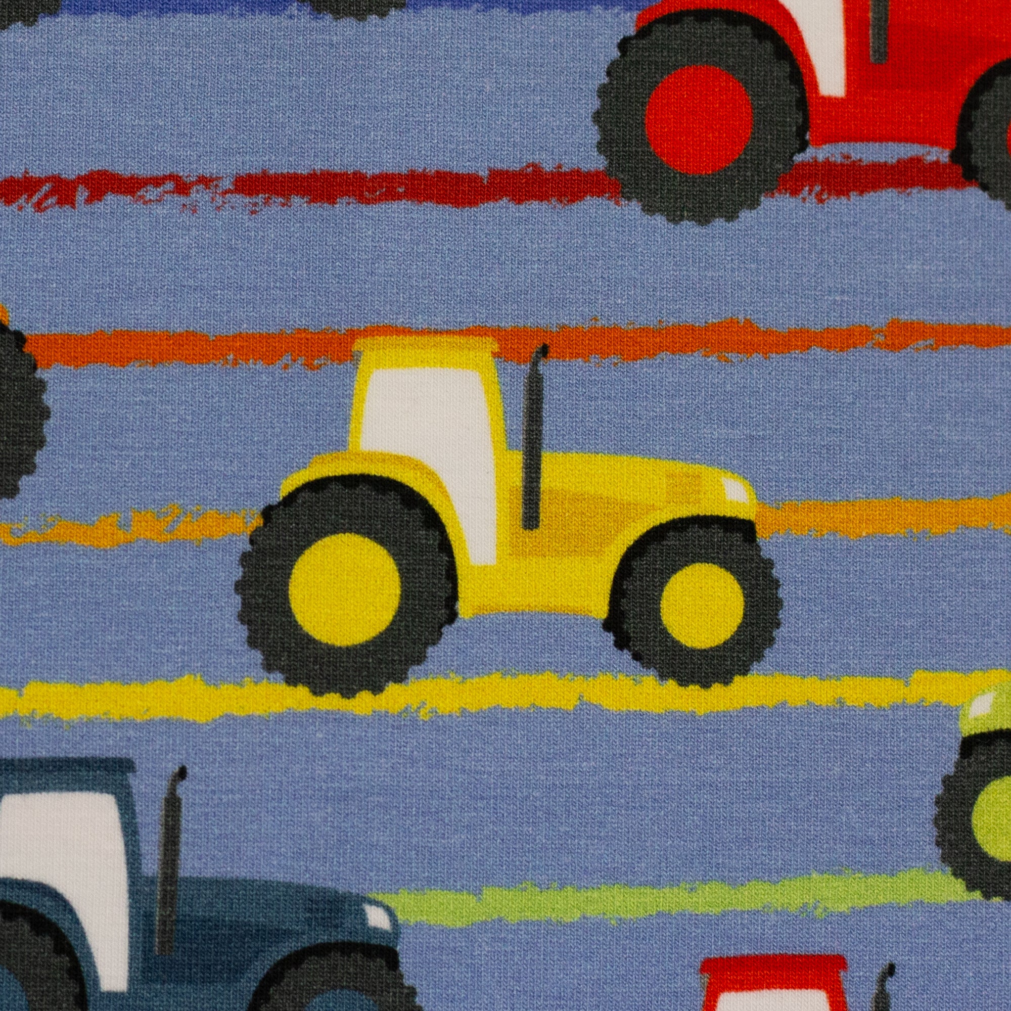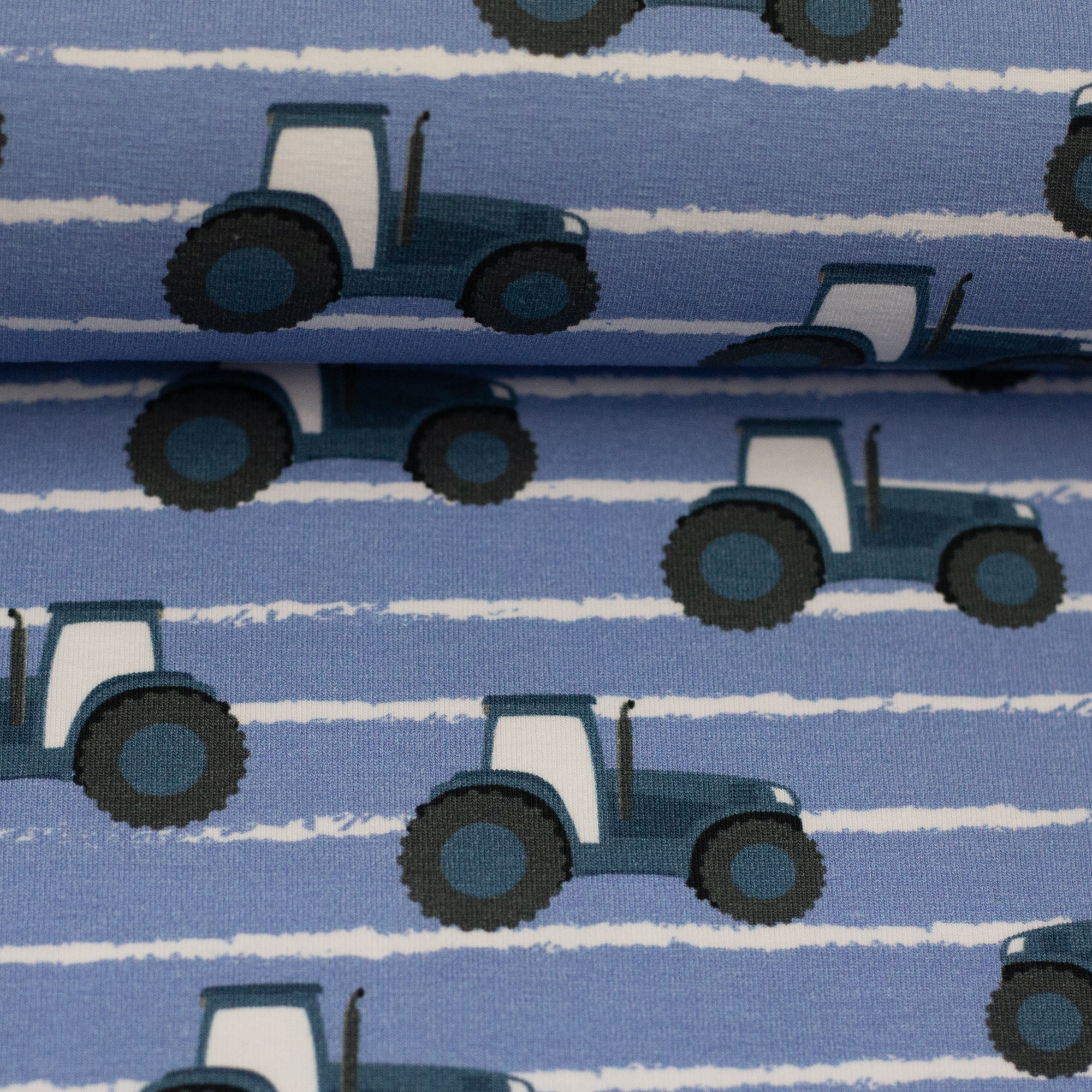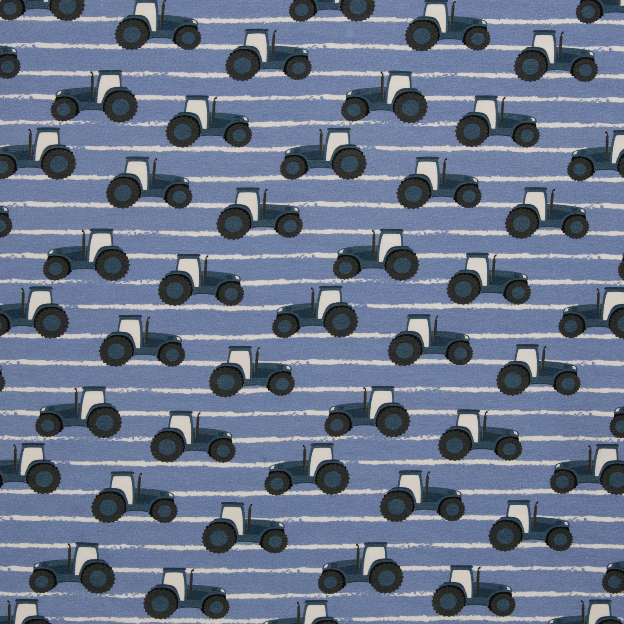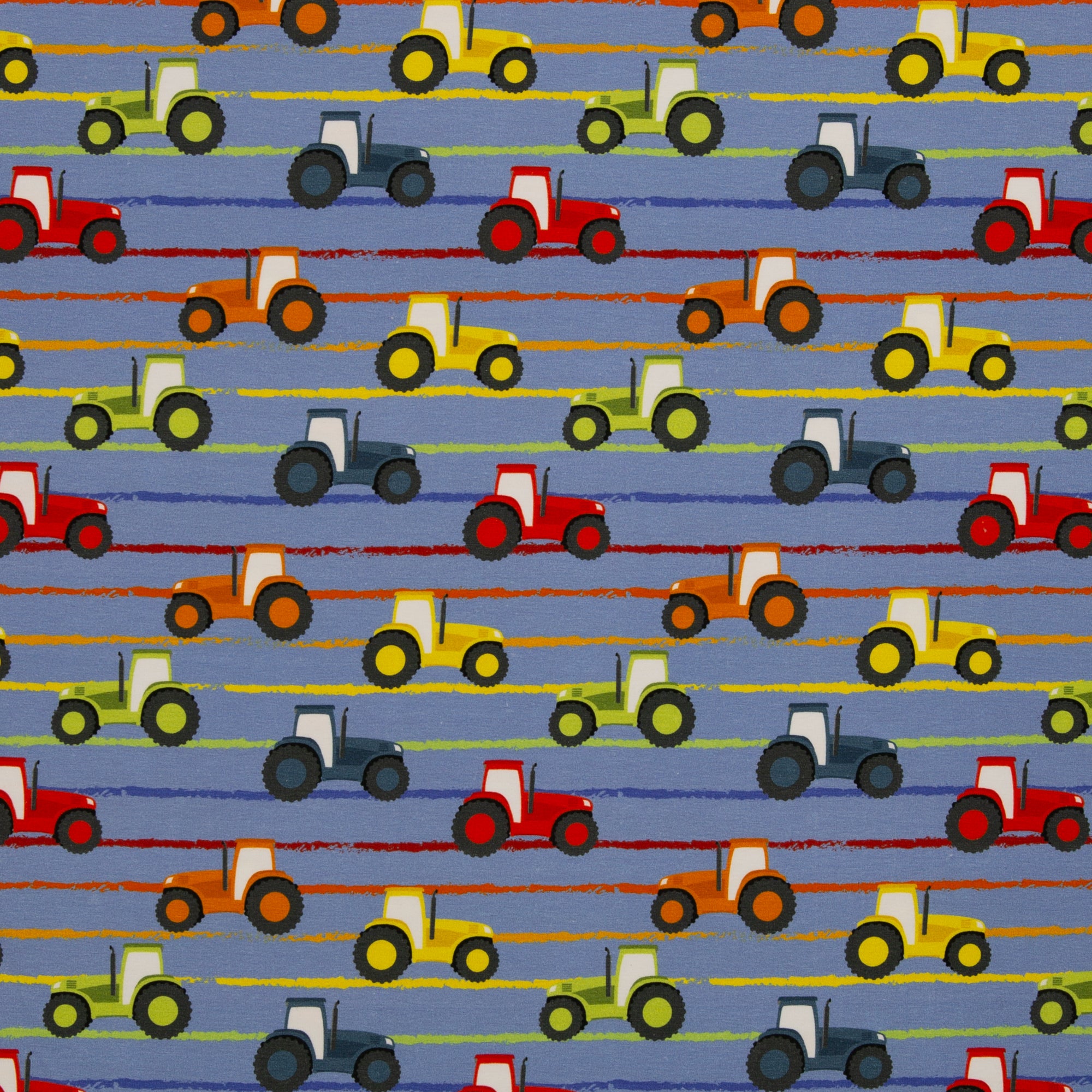 Bunte Traktoren fahren in Reihen über den Stoff und bringen Bewegung ins Design. Der Hintergrund ist als unregelmäßiger Streifen angelegt und verleiht dem Muster eine lockere, lebendige Optik. Die Variante in Jeansblau mit einfarbigem Traktor wirkt etwas ruhiger, bleibt aber klar kindgerecht.