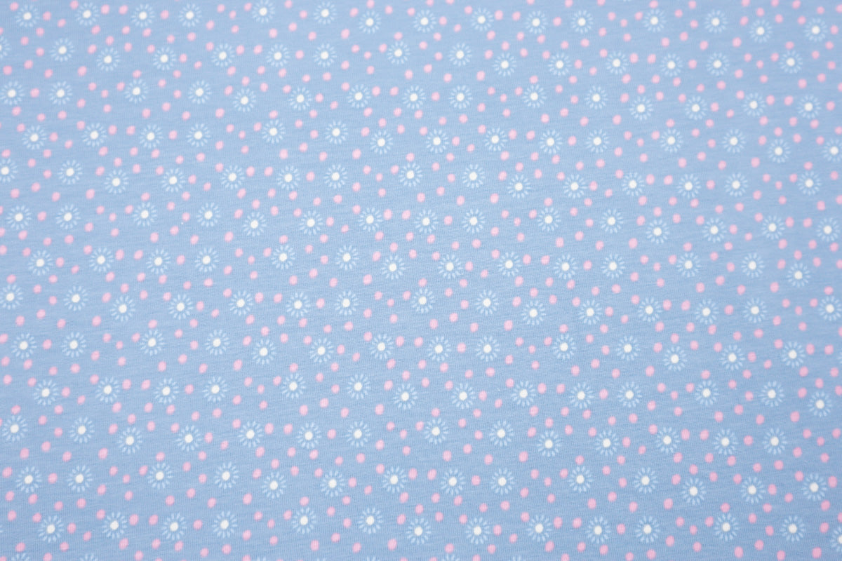 Schönes Muster mit kleinen Blümchen und Pünktchen auf rauchblauem Hintergrund.