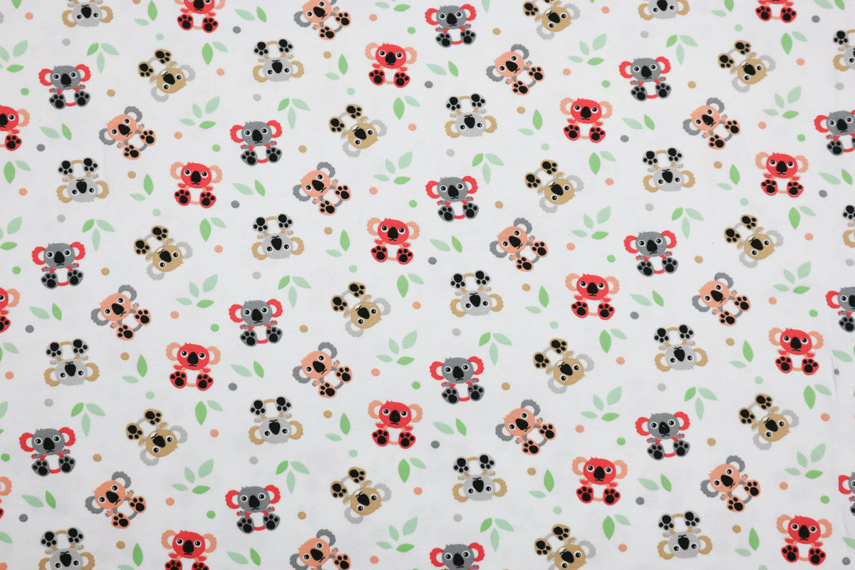 Super süßer Baumwolljersey für Kinder mit kleinen, bunten Koalabären auf weißem Grund.