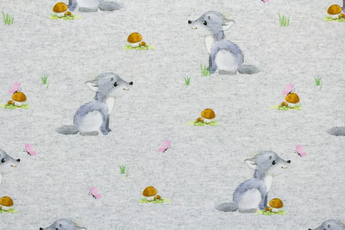 Niedliches kleines Wolfsmädchen auf grau meliertem Hintergrund.