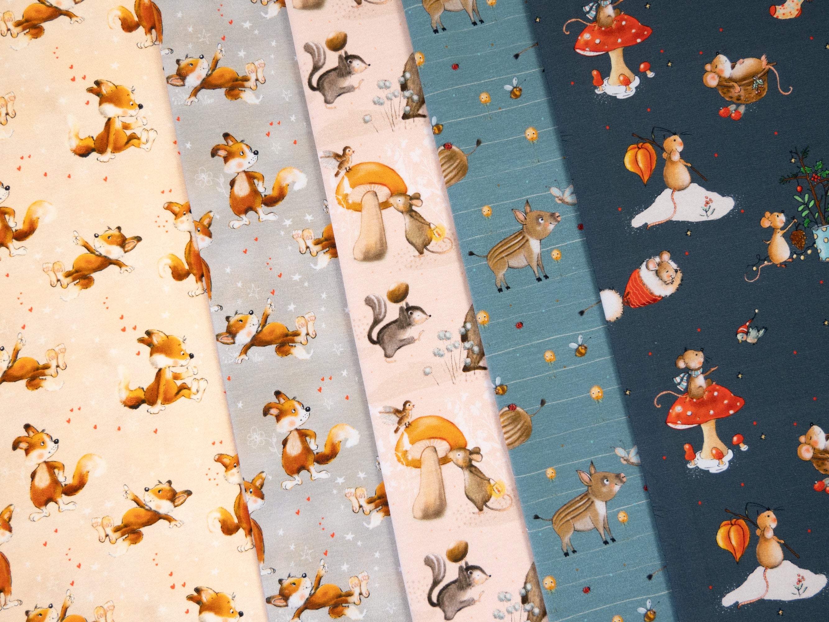 Es gibt Wildschweinferkel auf einem hellen Petrol mit ganz feinen Streifen und die kleinen Füchse auf einem vanilligen Beige und Hellgrau. Außerdem ein megasüßes Winterdesign mit Fliegenpilzen und Mäusen mit Weihnachtsmütze – sogar der Nikolausstrumpf und ein Weihnachtsgesteck dürfen nicht fehlen.