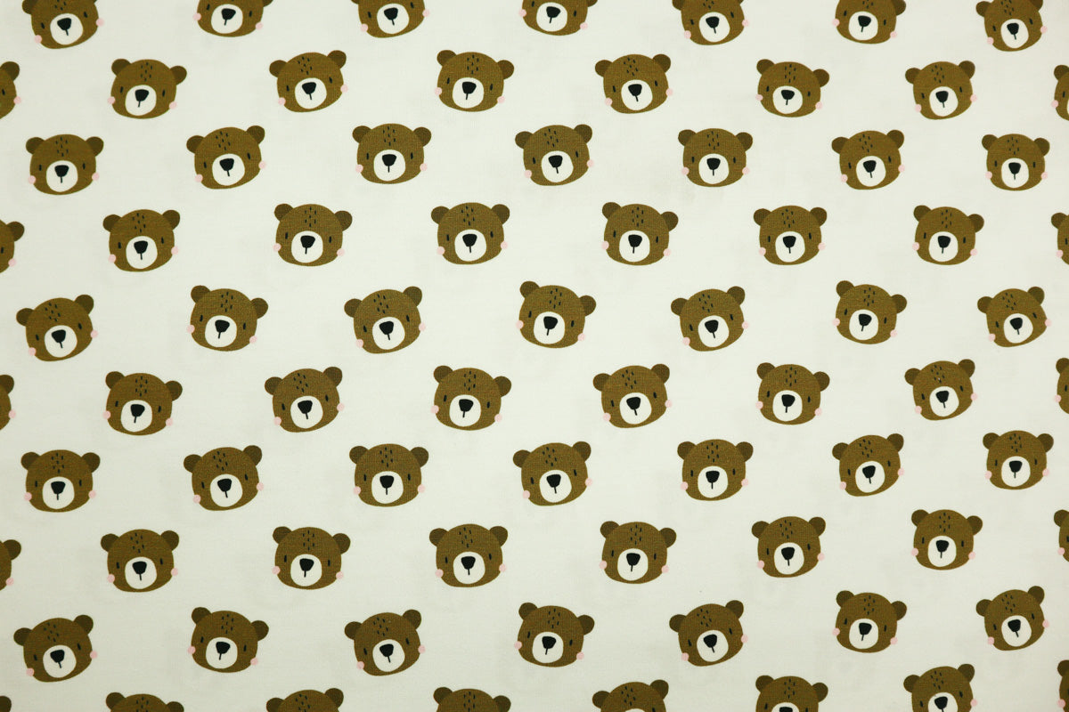 Niedliches Motiv mit kleinen Bärenköpfen mit rosa Wangen auf naturfarbenem Hintergrund.
