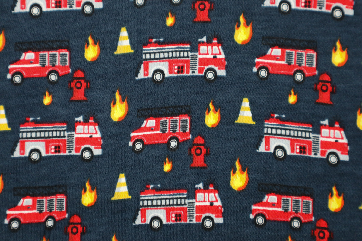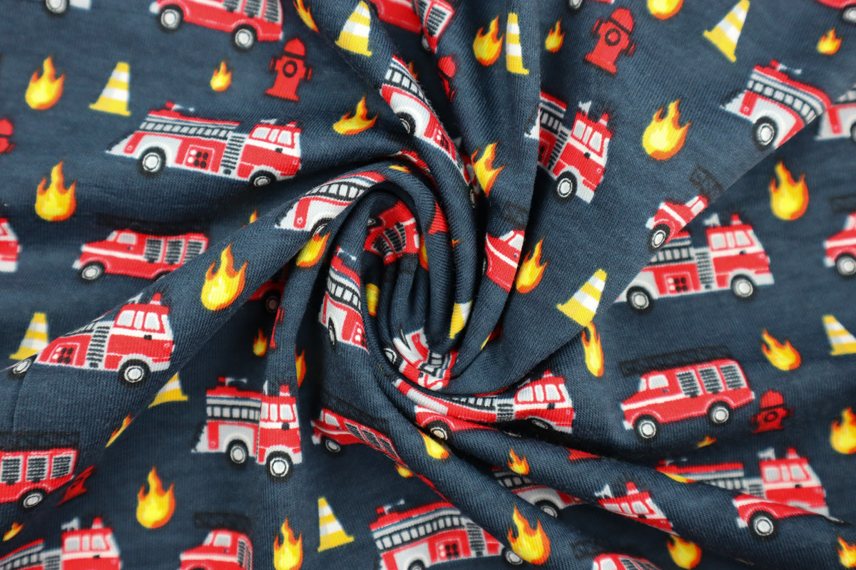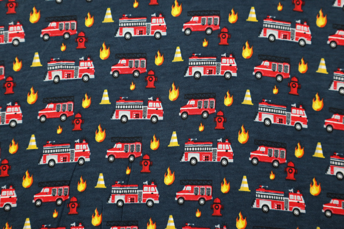 Toller Jersey mit verschiedenen Löschfahrzeugen auf dunkelblauem Hintergrund.