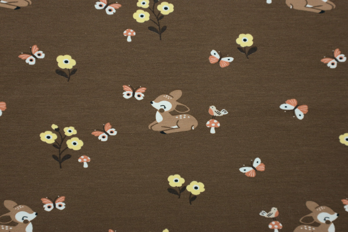 Niedliches Muster mit kleinen Rehkitzen, Schmetterlingen und Blümchen.