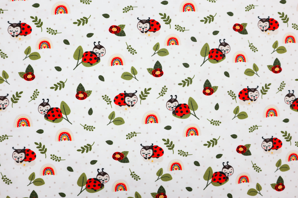 Zuckersüßes Design für Kinder mit kleinen Marienkäfern, Regenbögen, Blumen und Blättern in zarten Farben.