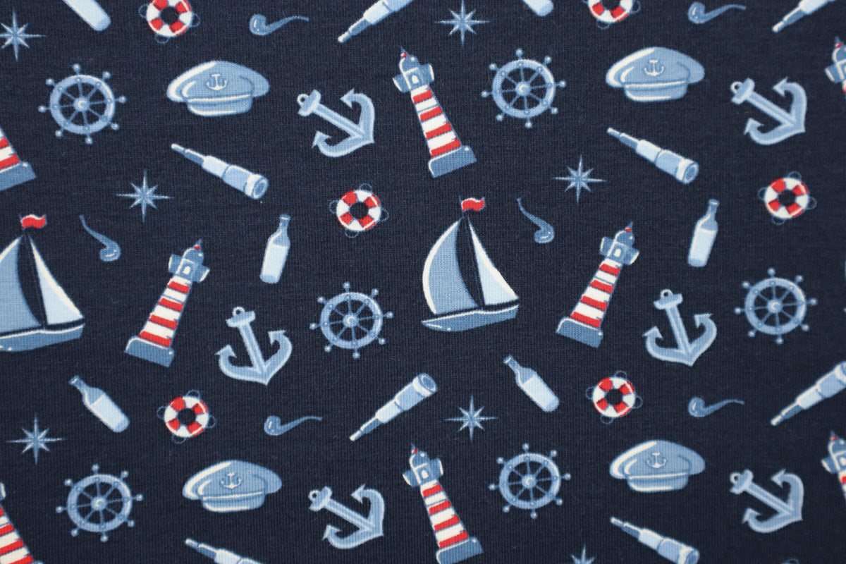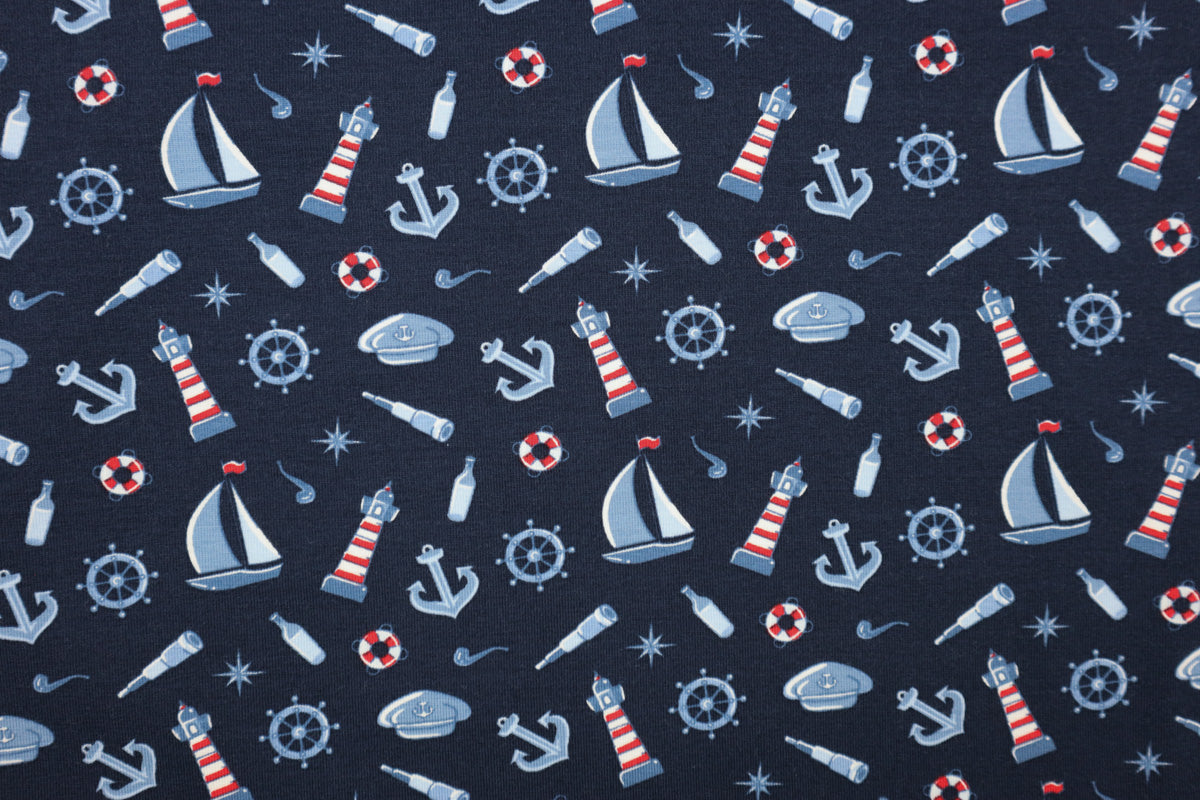 Maritimes Muster mit Leuchttürmen, Ankern, Schiffen, Steuerrädern, Rettungsringen und vielem mehr auf dunkelblauem Hintergrund.