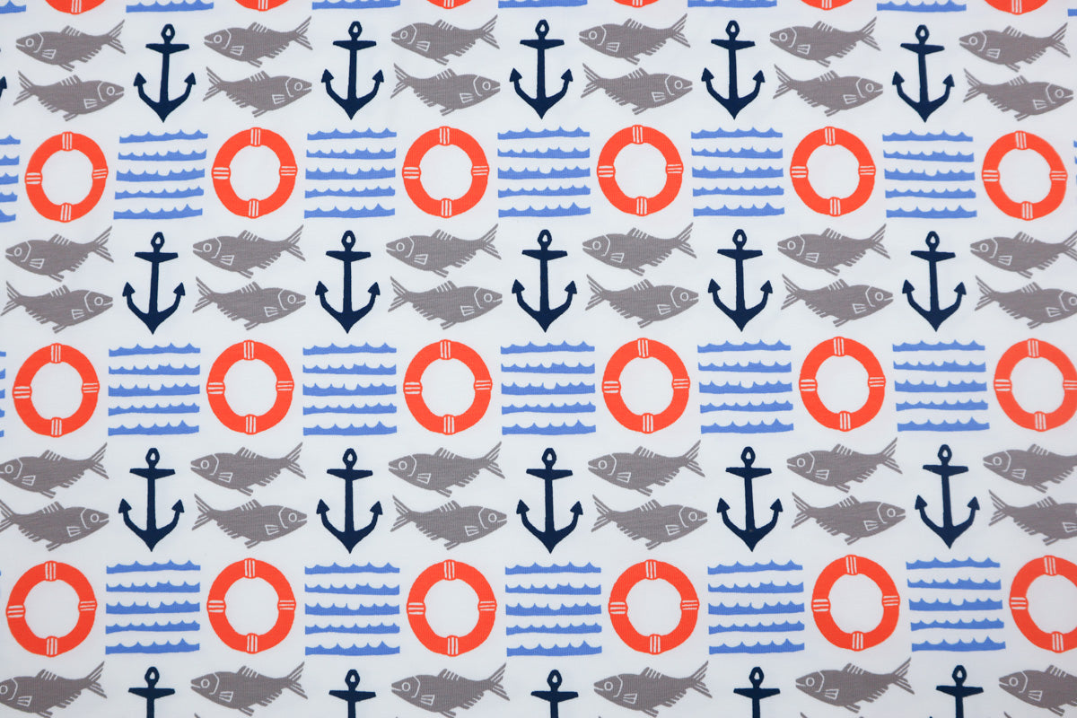 Super schönes maritimes Muster mit Ankern, Fischen , Rettungsringen und blauen Wellen.
