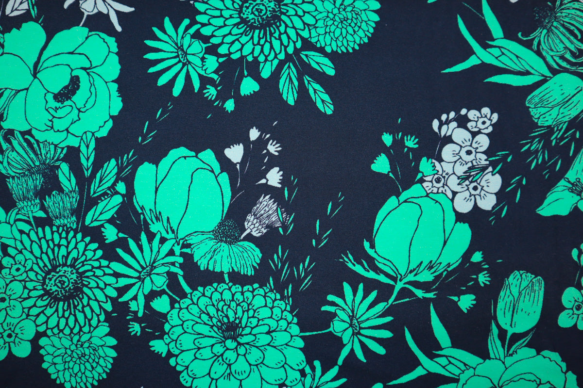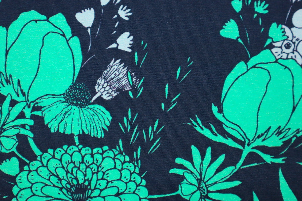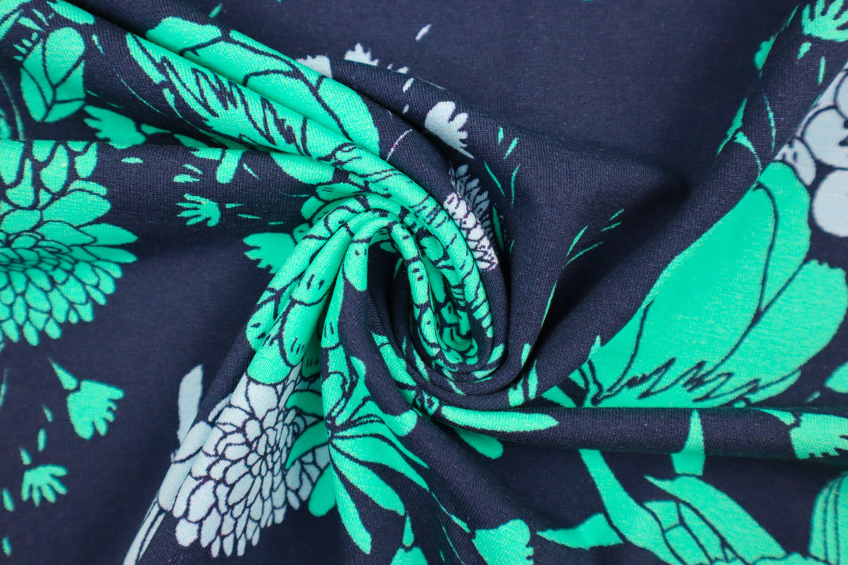 Schöner Baumwolljersey mit verspieltem Blütenmuster auf dunkelblauem Hintergrund.