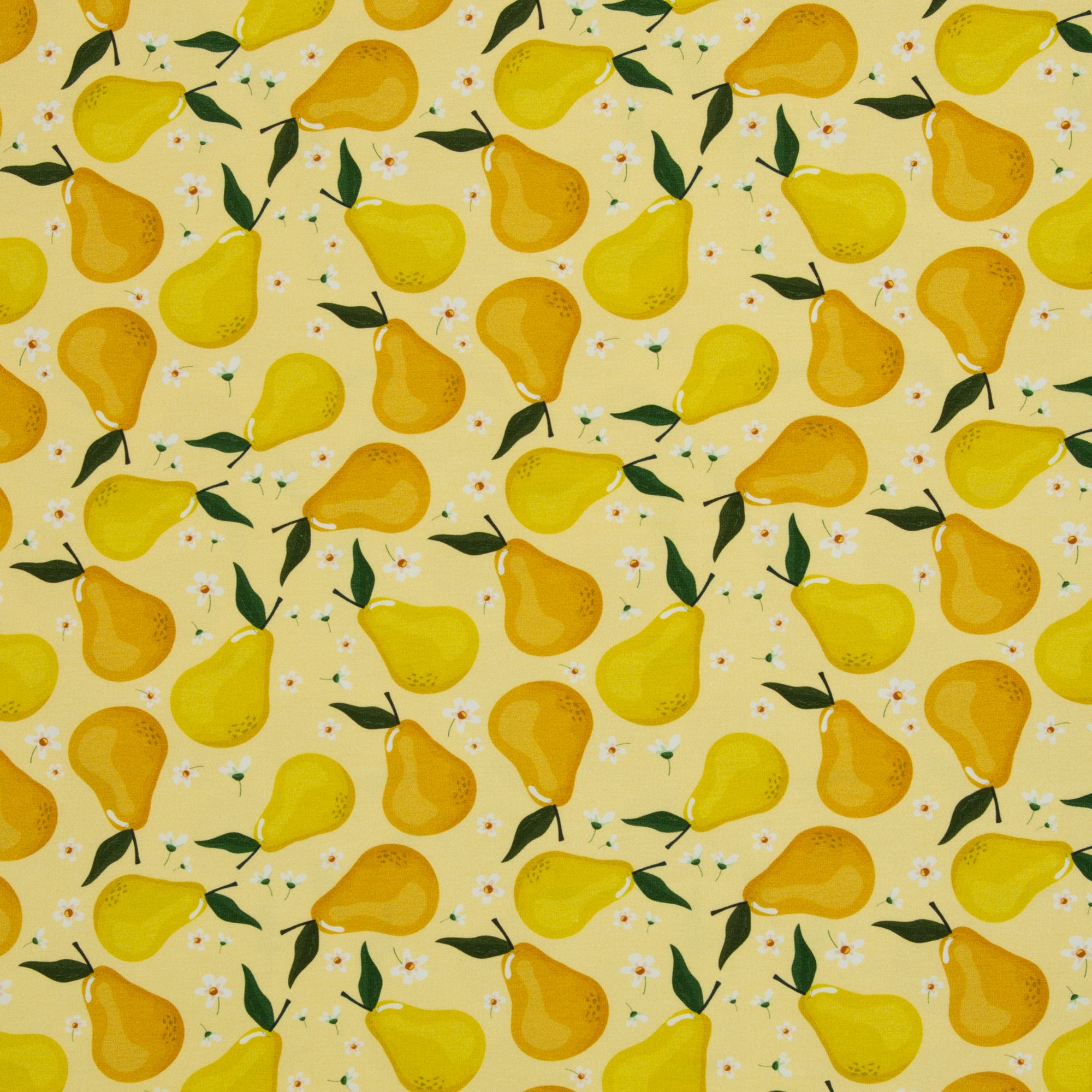 Zitronen, Birnen, Orangen und Limetten sorgen für sommerliche Frische, teilweise kombiniert mit dezenten Streifen im Hintergrund, die dem Design zusätzliche Struktur geben. Erdbeeren und Kirschen sind in mehreren Farbvarianten erhältlich – von zartem Rosa über Pink bis hin zu Blau- und Grüntönen. Die Motive sind klar gezeichnet, gleichmäßig verteilt und wirken lebendig, ohne zu dominant zu sein.