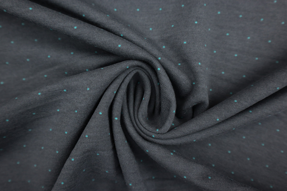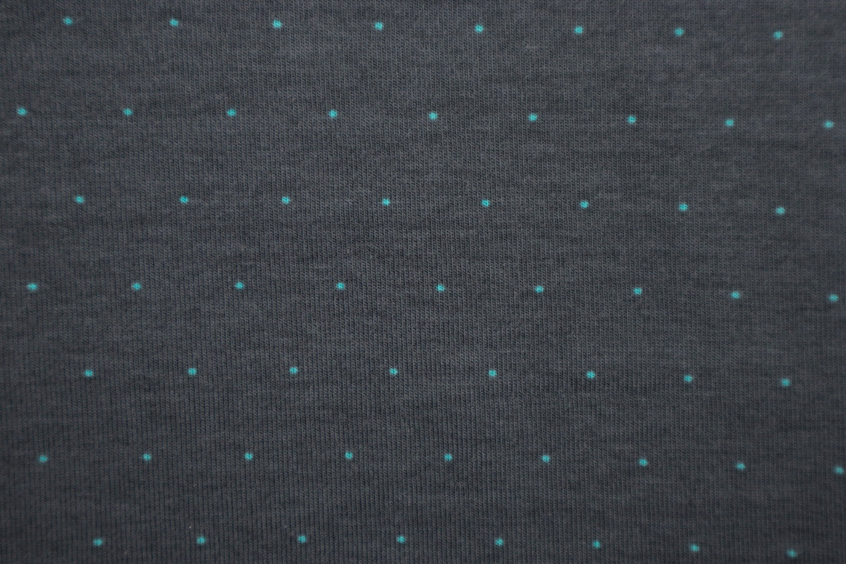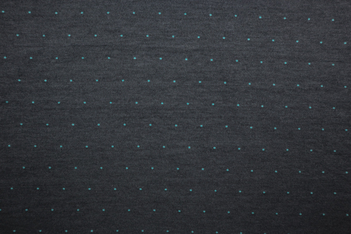Schöner Baumwolljersey mit mini kleinen , türkisen Punkten auf dunkelgrauem Hintergrund.