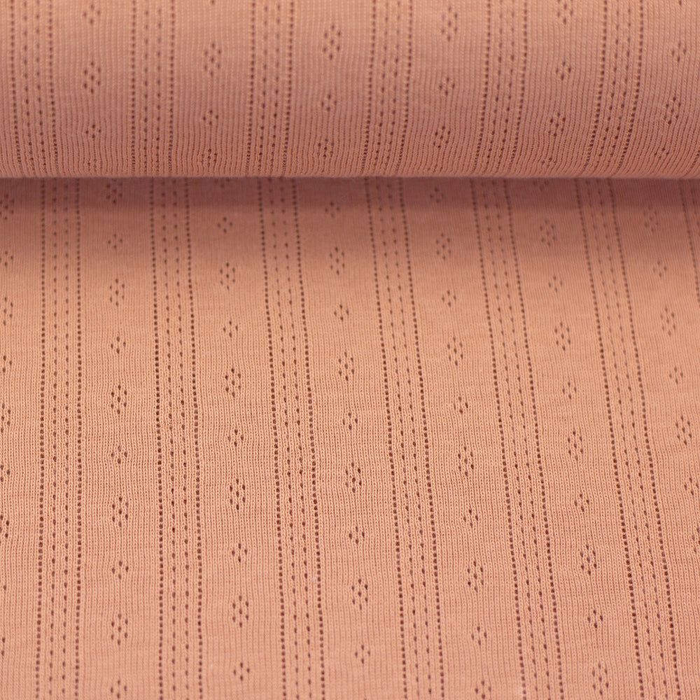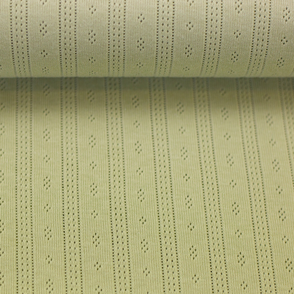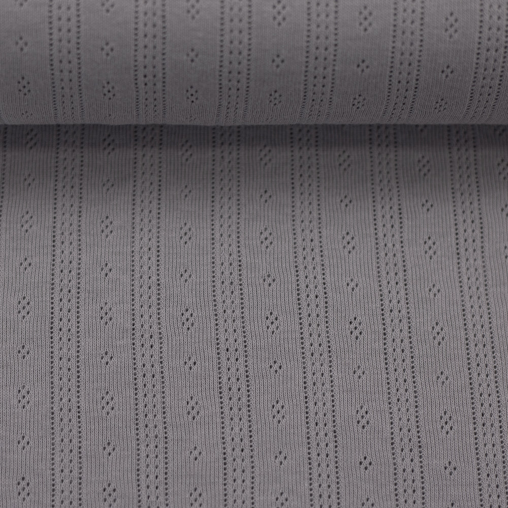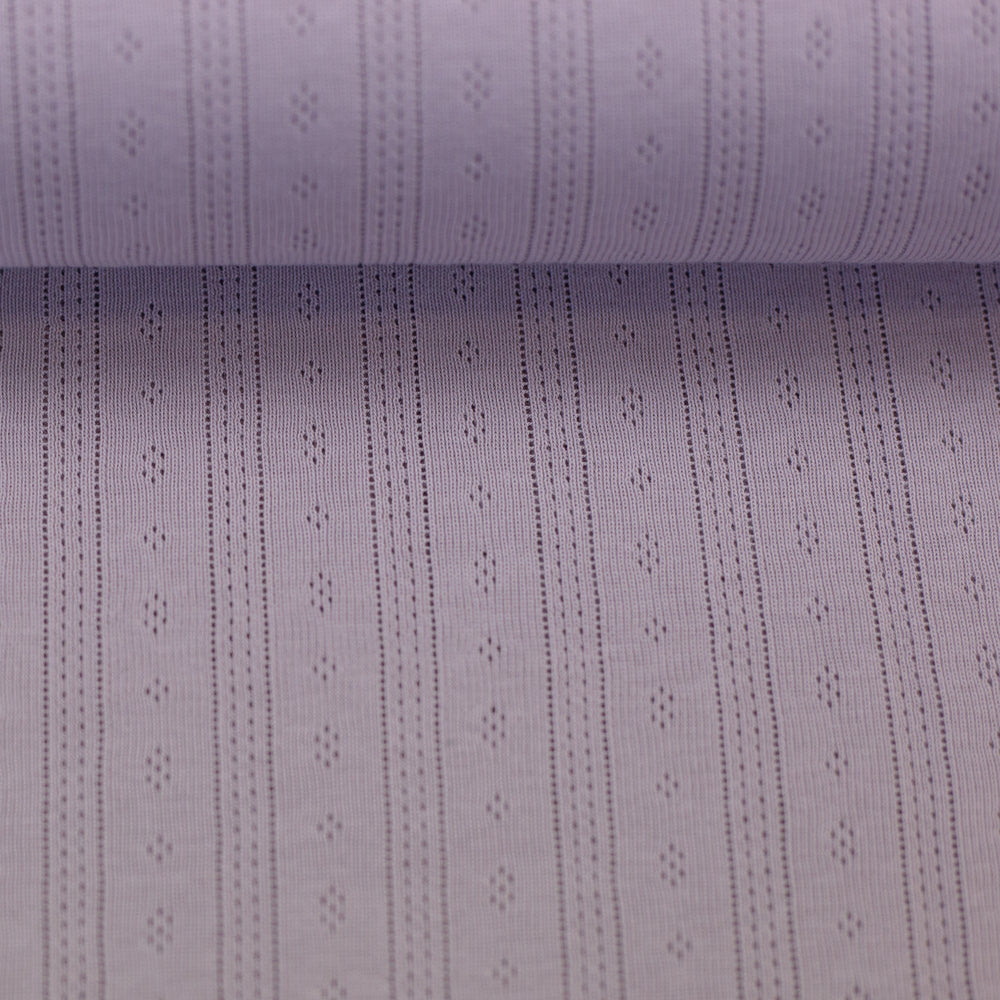 Der weiche Jersey mit Ajourmuster hat ein bezauberndes Muster mit kleinen Rauten und durchbrochenen Längsstreifen. Die Durchbrechungen sind so fein, dass der Stoff trotzdem blickdicht ist, man also nicht durch die kleinen Löcher hindurchsehen kann. Ideal für Oberteile, Kleider, Rollkragenshirts, Baby- und Kindermode, Mützen, Tücher und leichte Decken! Der schöne Pointille-Jersey trägt sich schön luftig und leicht und schmiegt sich wunderbar an.