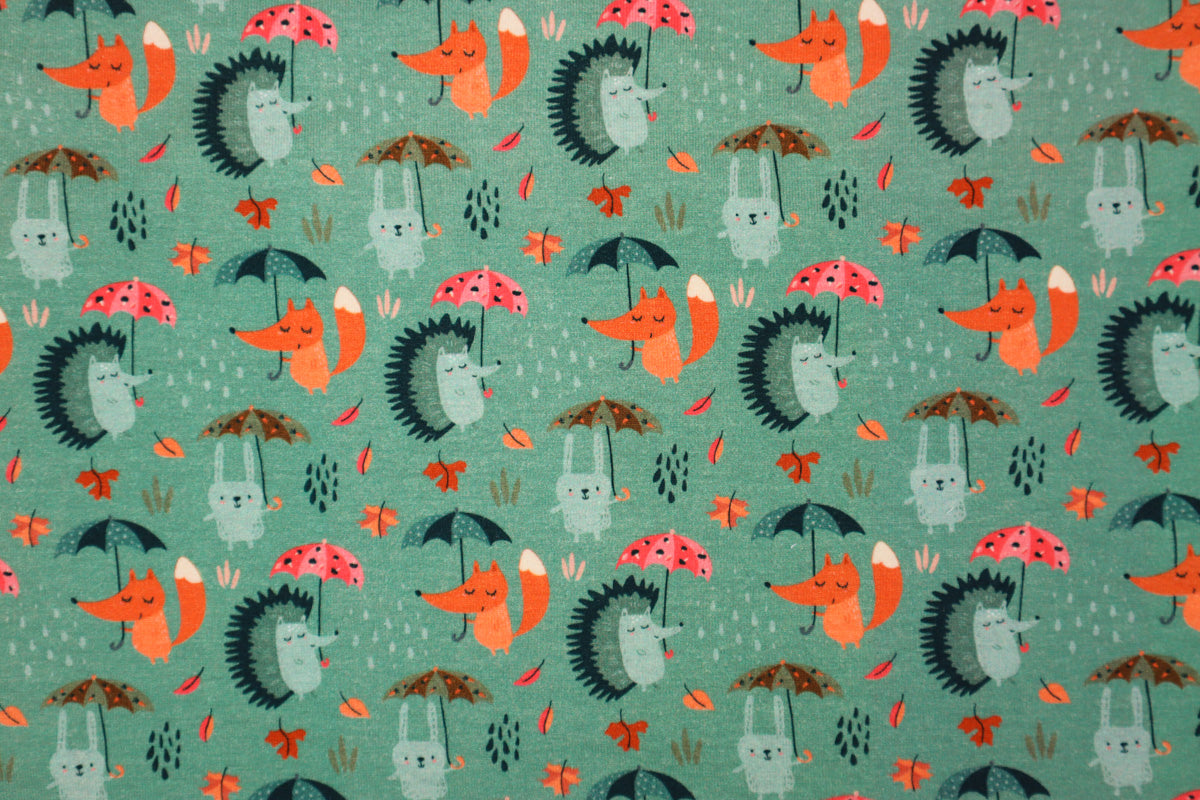 Niedliches Muster mit kleinen Igeln, Füchsen und Hasen im Regen und herbstlichen Blättern.