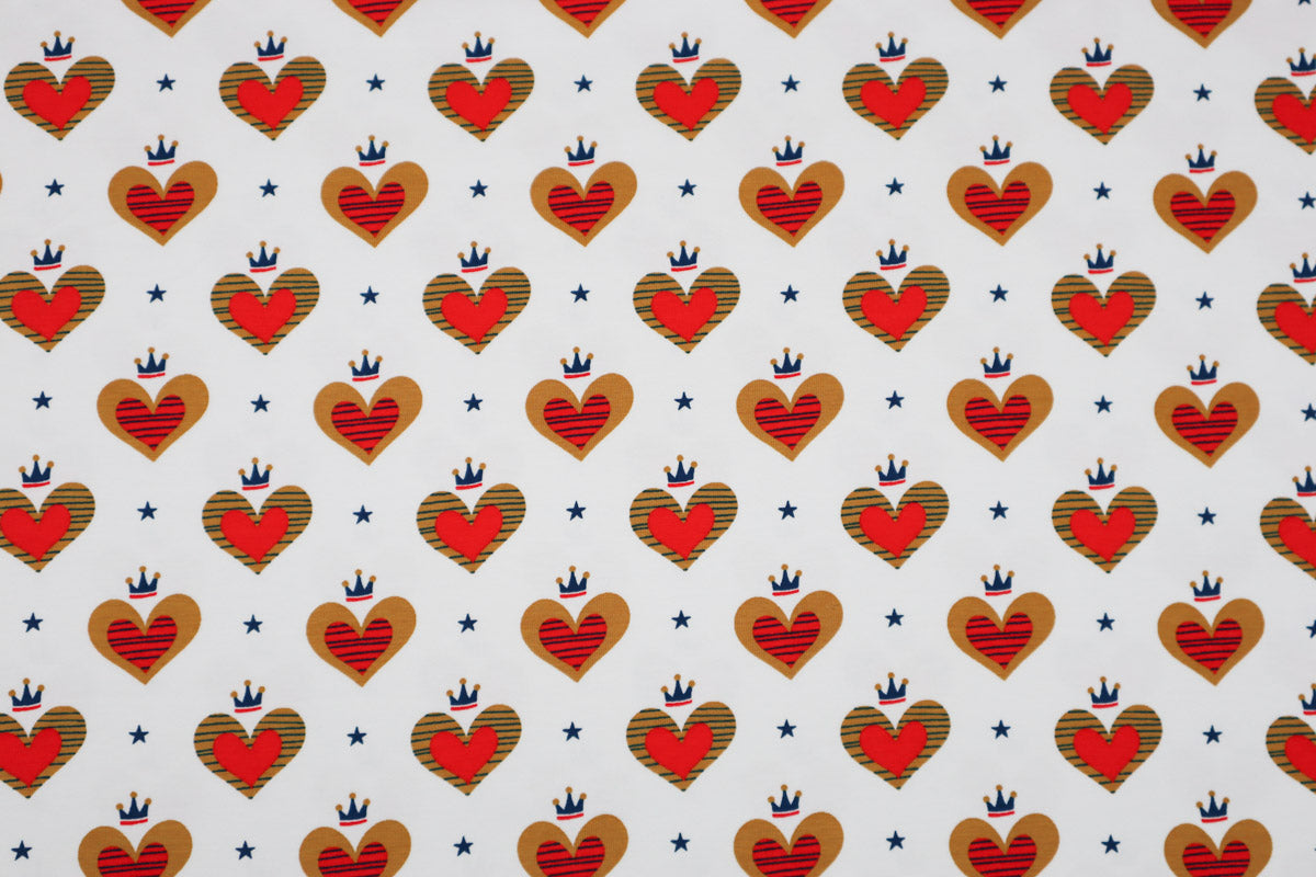 Toller Jersey mit Herzen, Kronen und Sternen auf weißem Hintergrund.