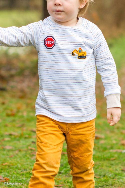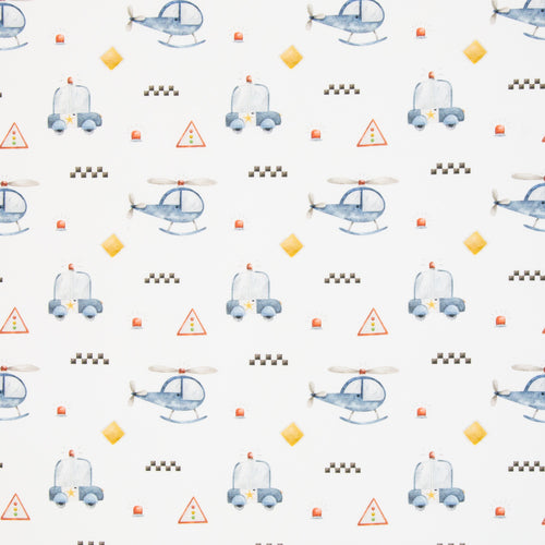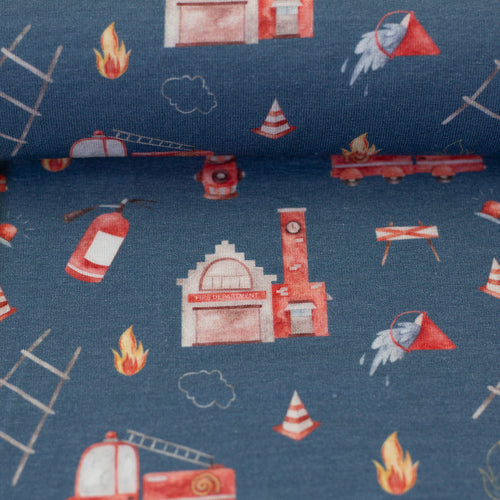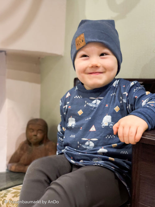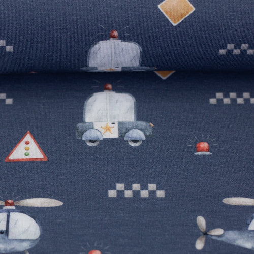 Polizeiauto und Hubschrauber, Löschzug, Feuerlöscher und allerlei Feuerwehrmotive kommen in einer wunderschönen Aquarelloptik auf Baumwolljersey in Jeansblau und Weiß. Dazu passen die schmalen, unregelmäßigen Querstreifen