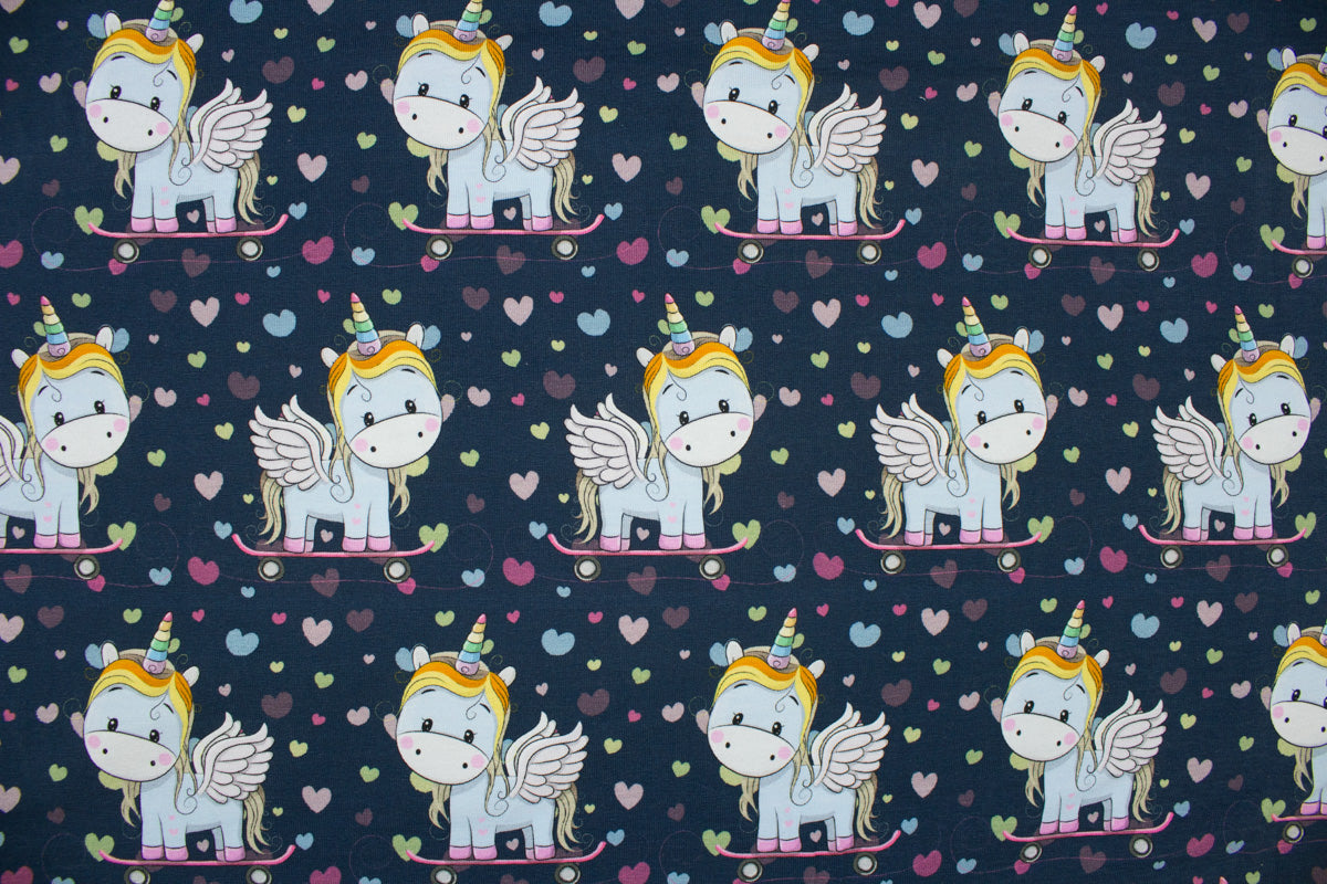 Das niedliche kleine Einhorn mit seiner bunten Mähne - verträumt auf dem Skateboard.