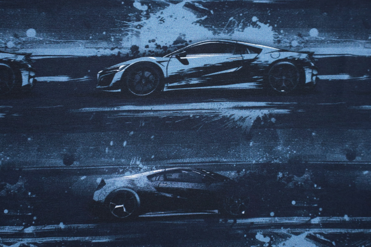 Richtig cooles Muster mit schnellem Sportwagen auf nachtblauem Hintergrund.
