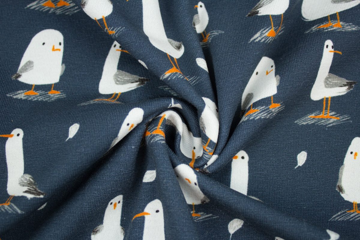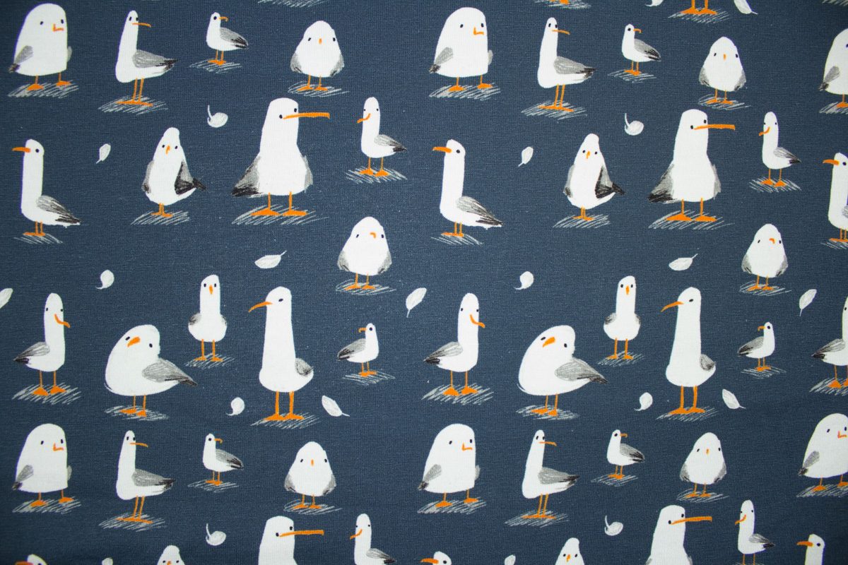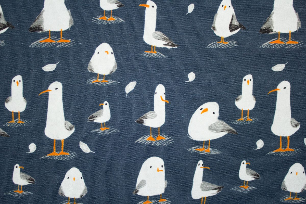 Schöner, maritimer Jerseystoff mit Möwen auf dunkelblauem Hintergrund.