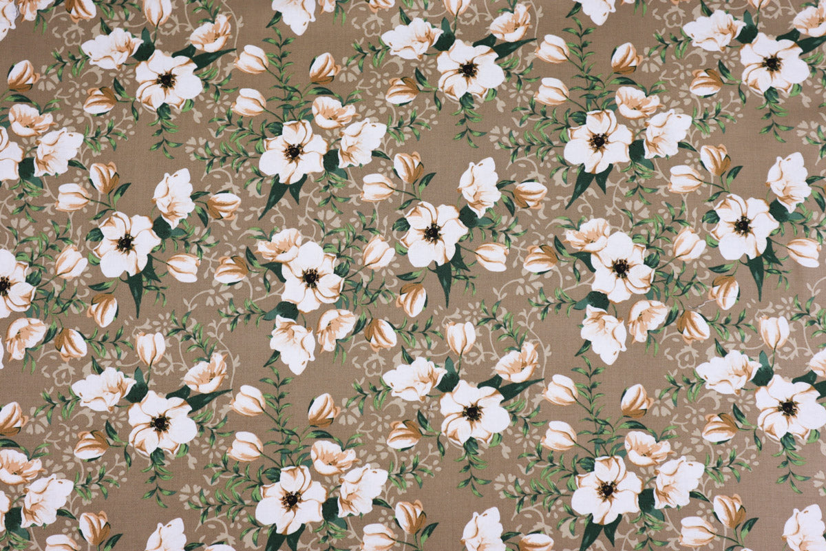 Wunderschöner Baumwollstoff mit weißen Blüten auf hellbraunem Grund.