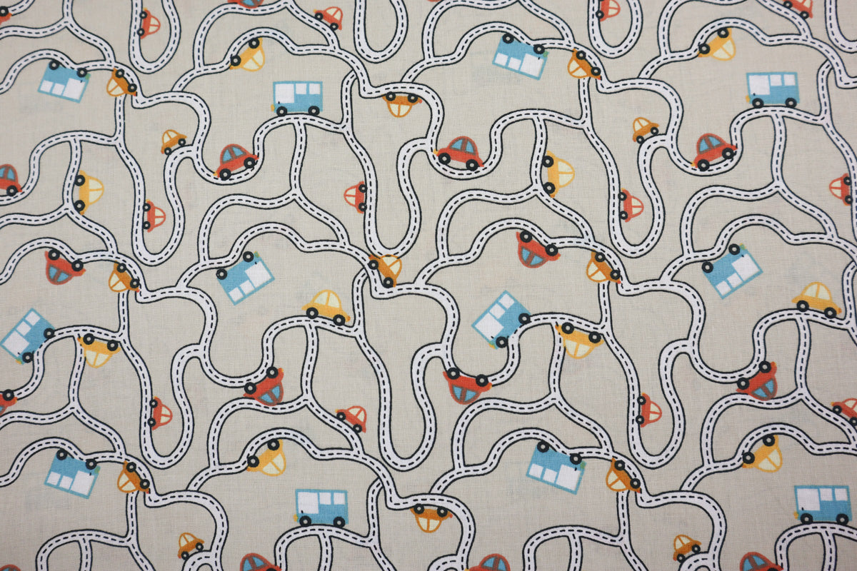Kleine Autos und kurvige Straßen auf sandfarbenem Hintergrund.