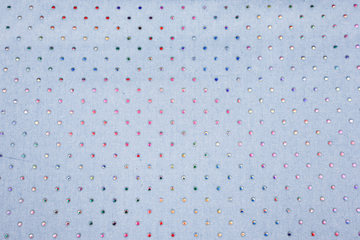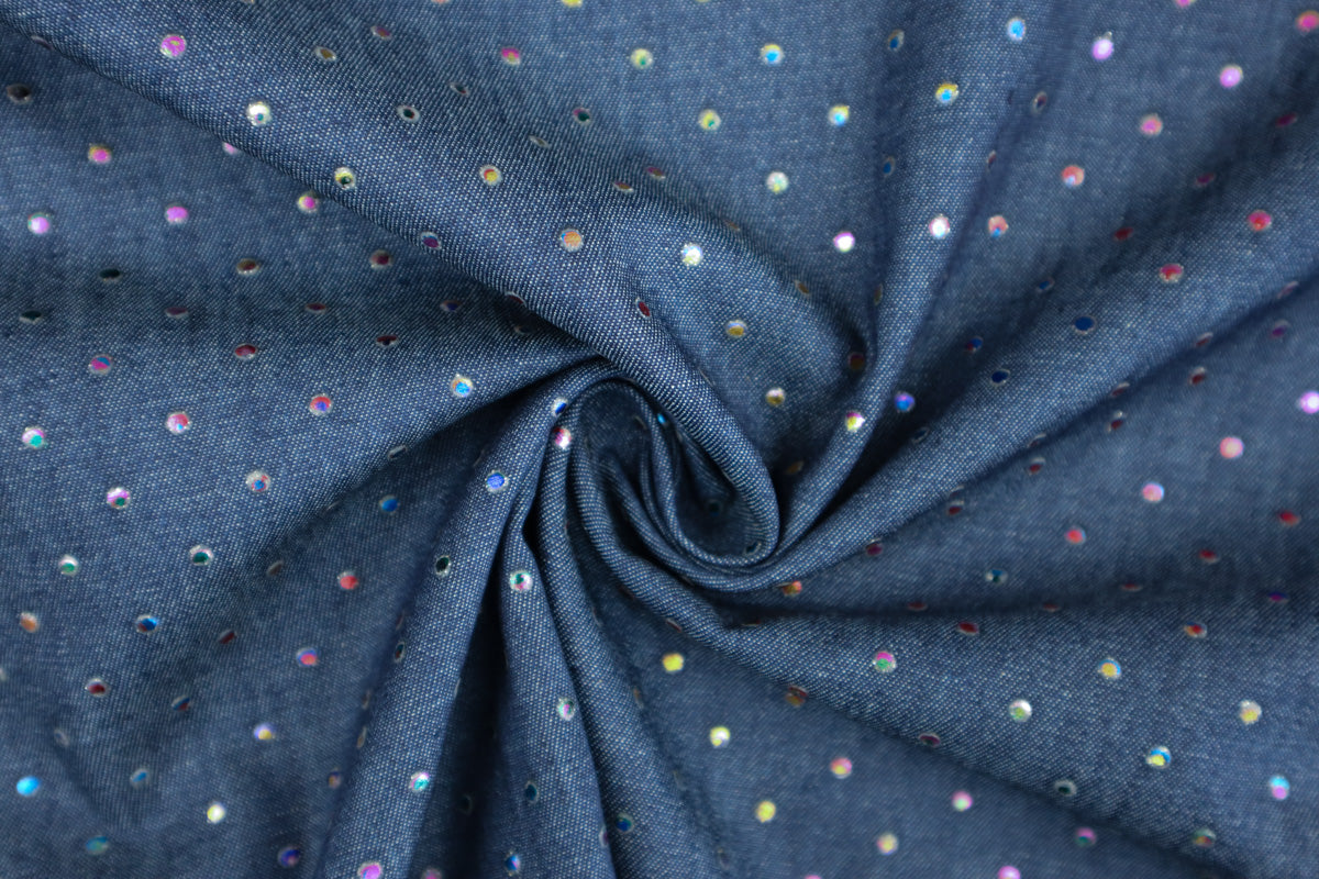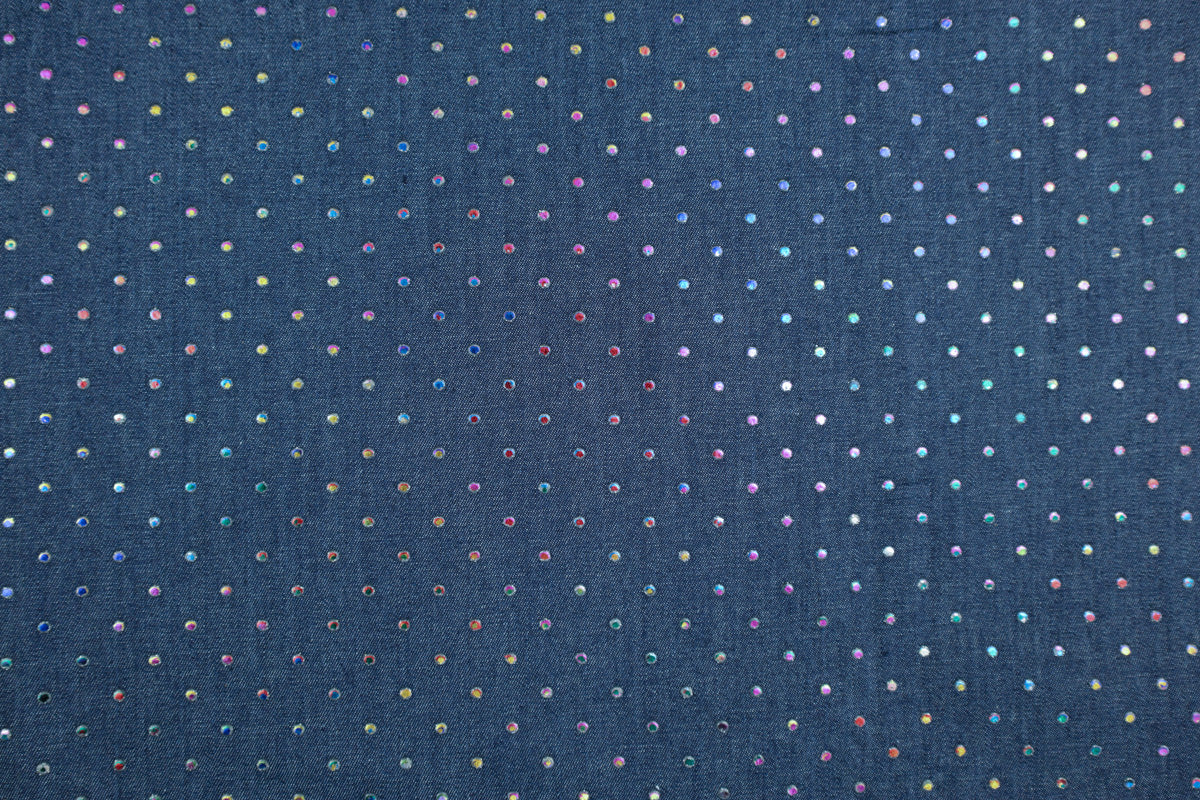 Baumwollstoff in Jeansoptik mit bunten , aufgesetzten Punkten.