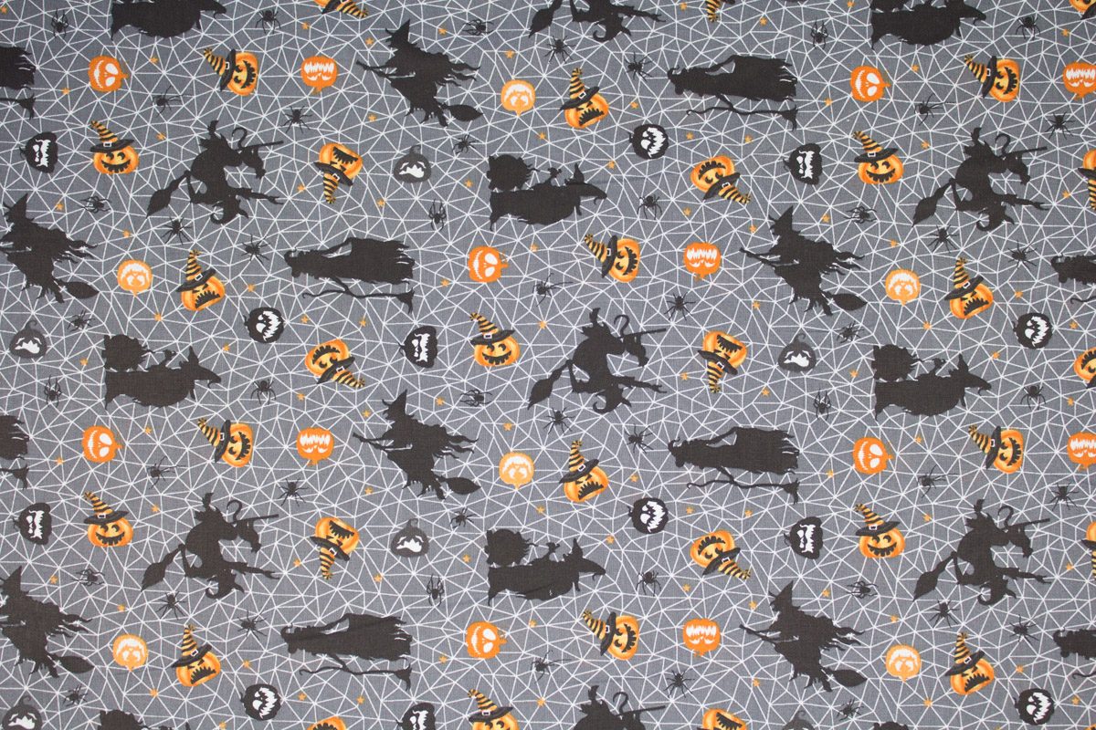 Gruseliges Design mit Kürbissen, Hexen und Spinnen.