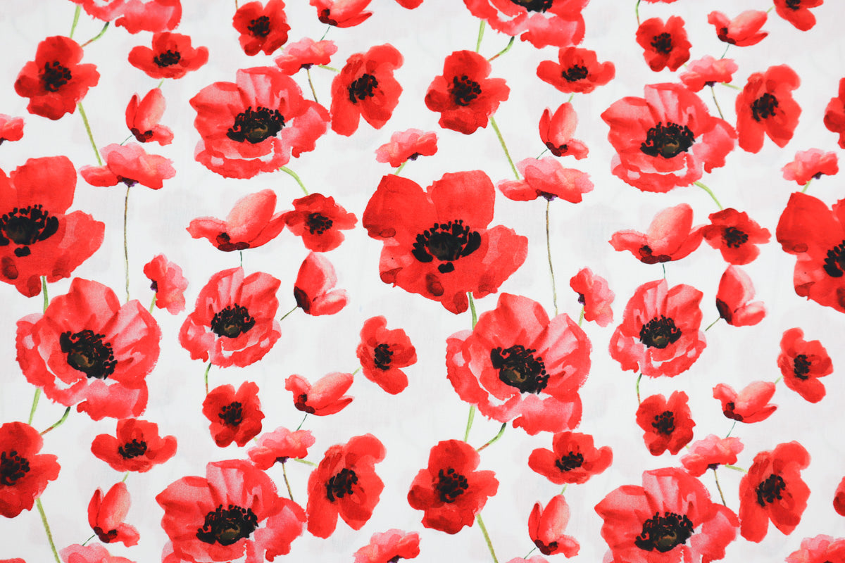 Auffälliges Muster mit knallroten Mohnblüten auf weißem Hintergrund.
